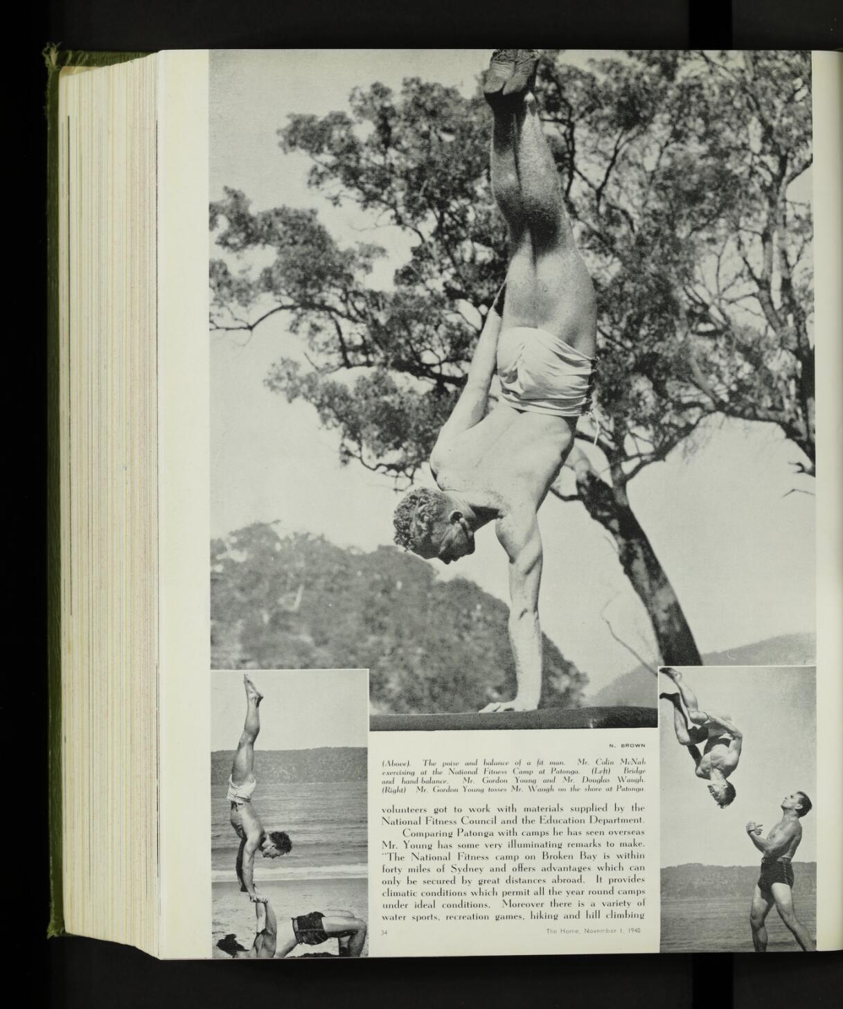(Above). The poise and balance of a fit man. Mr. Colin McNab exercising at the National Fitness Camp at Patonga. (Left) Bridge and hand balance. Mr. Gordon Young and Mr. Douglas Waugh. (Right) Mr. Gordon Young tosses Mr. Waugh on the shore at Patonga. N. BROWN
