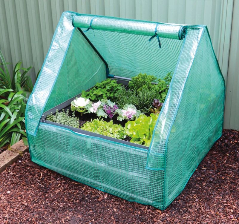 Includes garden bed 850(L) x 850(W) x 300(H)cm, drop over greenhouse 900(L) x 900(W) x 920(H)cm gardening gloves and store bag. (Plants sold separately.)