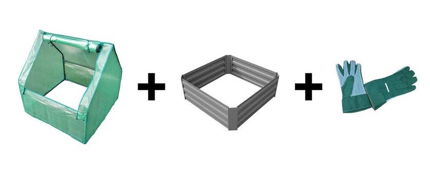 Garden bed L850 x W850 x H300mm. Drop over greenhouse L900 x W900 x H920mm. Gardening gloves and storage bag. Plants sold separately.