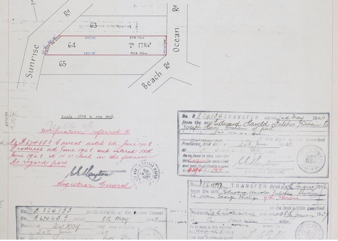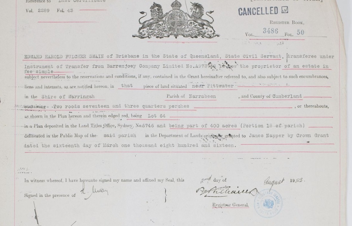 The Certificate of Title for the Barrenjoey Company Limited series is Volume 2289 – Folio 43, which will also bring up, if you use this to search through the Historical Land Records View (HRLV) those early lands sales until they sold what was left to the 1924 formed Palm Beach Lands company; See Vol-Fol: 3758-71 for the Palm Beach Land Co. phase.