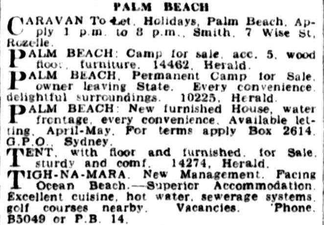 For selling liquor without a licence at the Palladium, Palm Beach, on November 11, Duncan Osborne, 57, storeman, was fined £30 or 60 days by Mr. Arnott, S.M., in the Metropolitan Licensing Court yesterday. Clifton Wooden, 27, storekeeper, charged with appearing and manager of the premises and having failed to produce the authority to sell liquor, was fined £10 or 20 days. SLY-GROG SOLD AT PALM BEACH (1933, November 21). The Labor Daily (Sydney, NSW : 1924 - 1938), p. 6. Retrieved from http://nla.gov.au/nla.news-article237909123