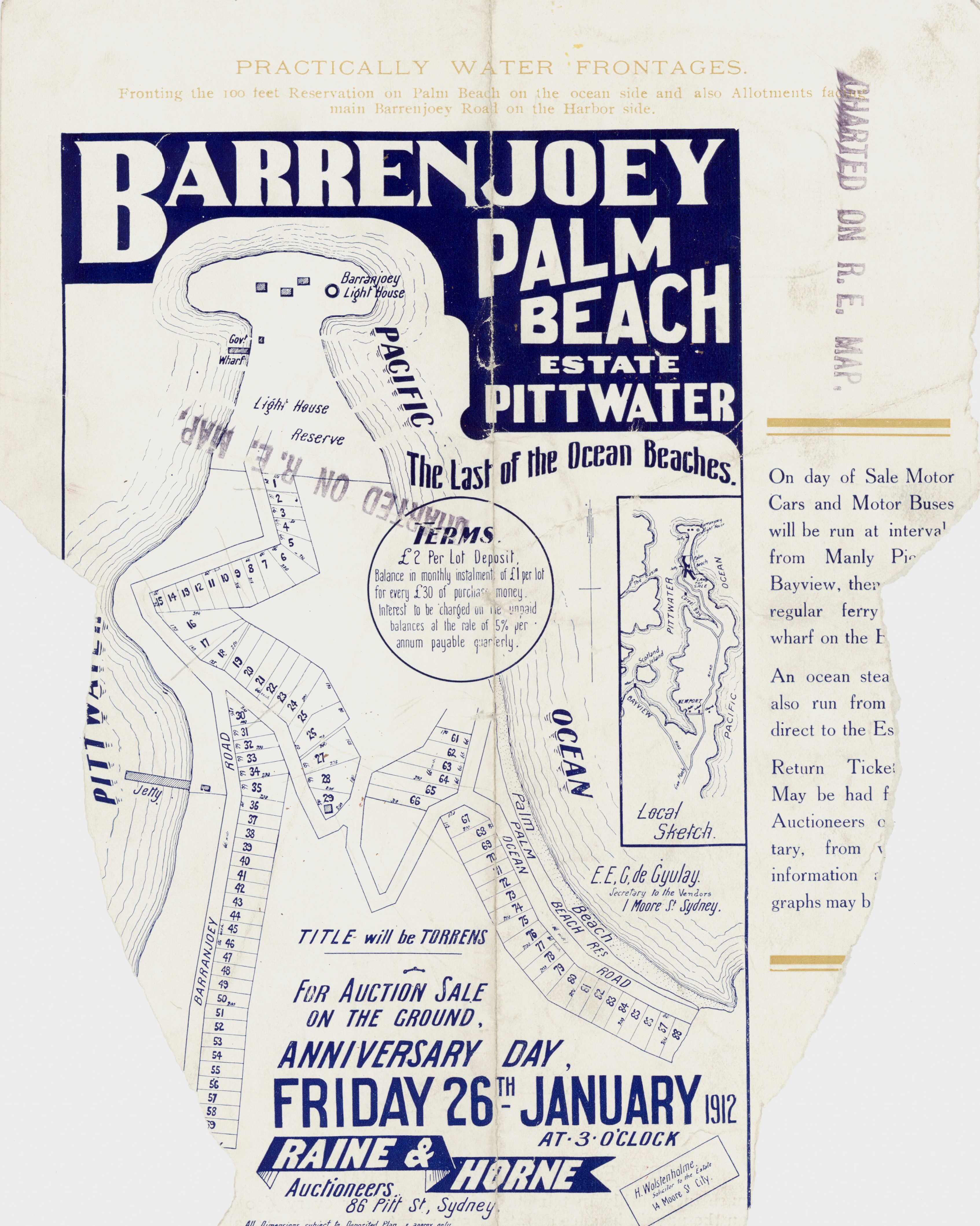 The remainder was then offered for sale by the Barrenjoey Land company, who acquired the same from James Channon in July 1911.