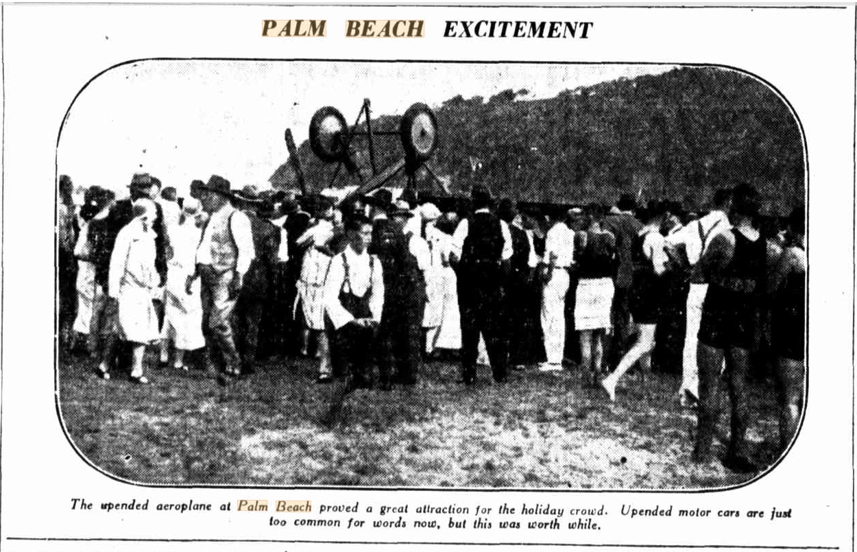 Upended plane at Palm Beach PALM BEACH EXCITEMENT (1926, February 15). The Sun (Sydney, NSW : 1910 - 1954), p. 10 (FINAL EXTRA). Retrieved from http://nla.gov.au/nla.news-article224060139