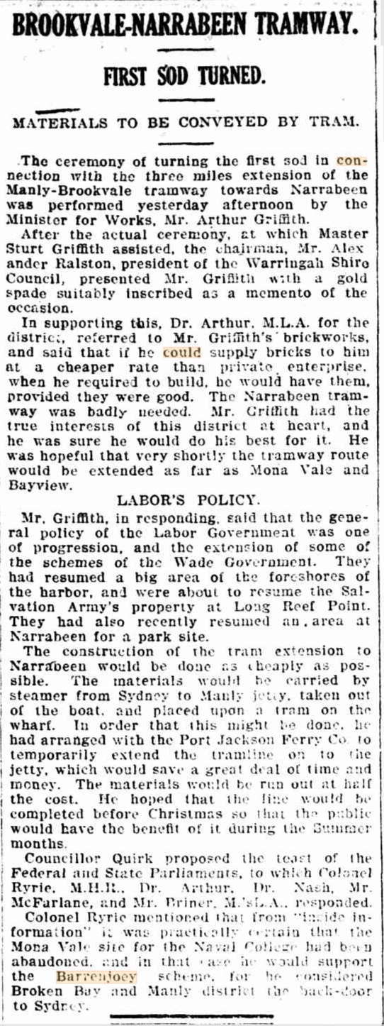 In June 1911, just after the tramline to Brookvale opened, a group of businessmen registered the 'Barrenjoey Company', and led by John Ralston, succeeded in purchasing the Bassett-Darley Barrenjoey acreage. Some sources state they paid a whopping £500 - the proprietors apparently wanted at least £1900.00 but settled for what they could get: