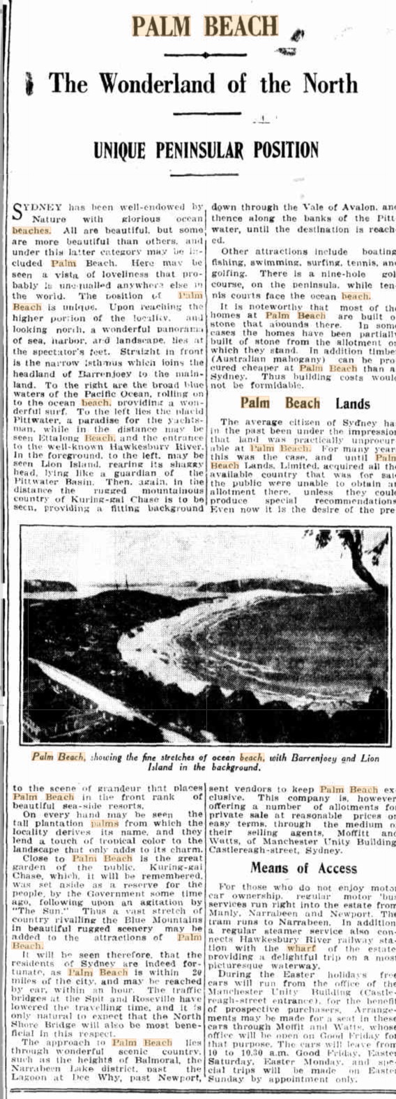 PALM BEACH VIEWS (1925, April 24). The Sun (Sydney, NSW : 1910 - 1954), p. 11 (FINAL EXTRA). Retrieved from http://nla.gov.au/nla.news-article224043905