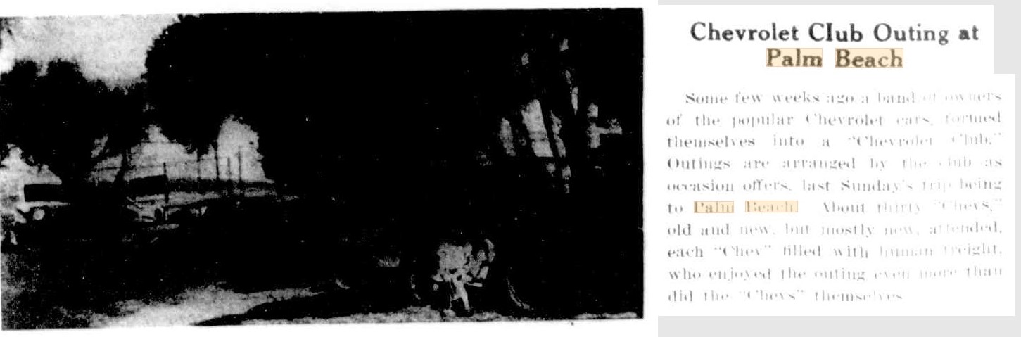Some few weeks ago a band of owners of the popular Chevrolet cars, formed themselves into a ''Chevrolet Club.' Outings are arranged by the club as occasion offers, last Sunday's trip being to Palm Beach. About thirty 'Chevs,' old and new. but mostly new, attended, each 'Chev' filled with human freight, who enjoyed the outing even more than did the 'Chevs' themselves. Withers & Head Photo. Service.