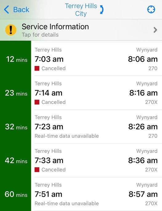 The same experience is occurring for those commuting from Frenchs Forest or Terry Hills to town or Chatswood - many of their peak hour services are cancelled while they are waiting at the bus stop to catch the bus - meaning more cars are being added to already bad traffic jams.