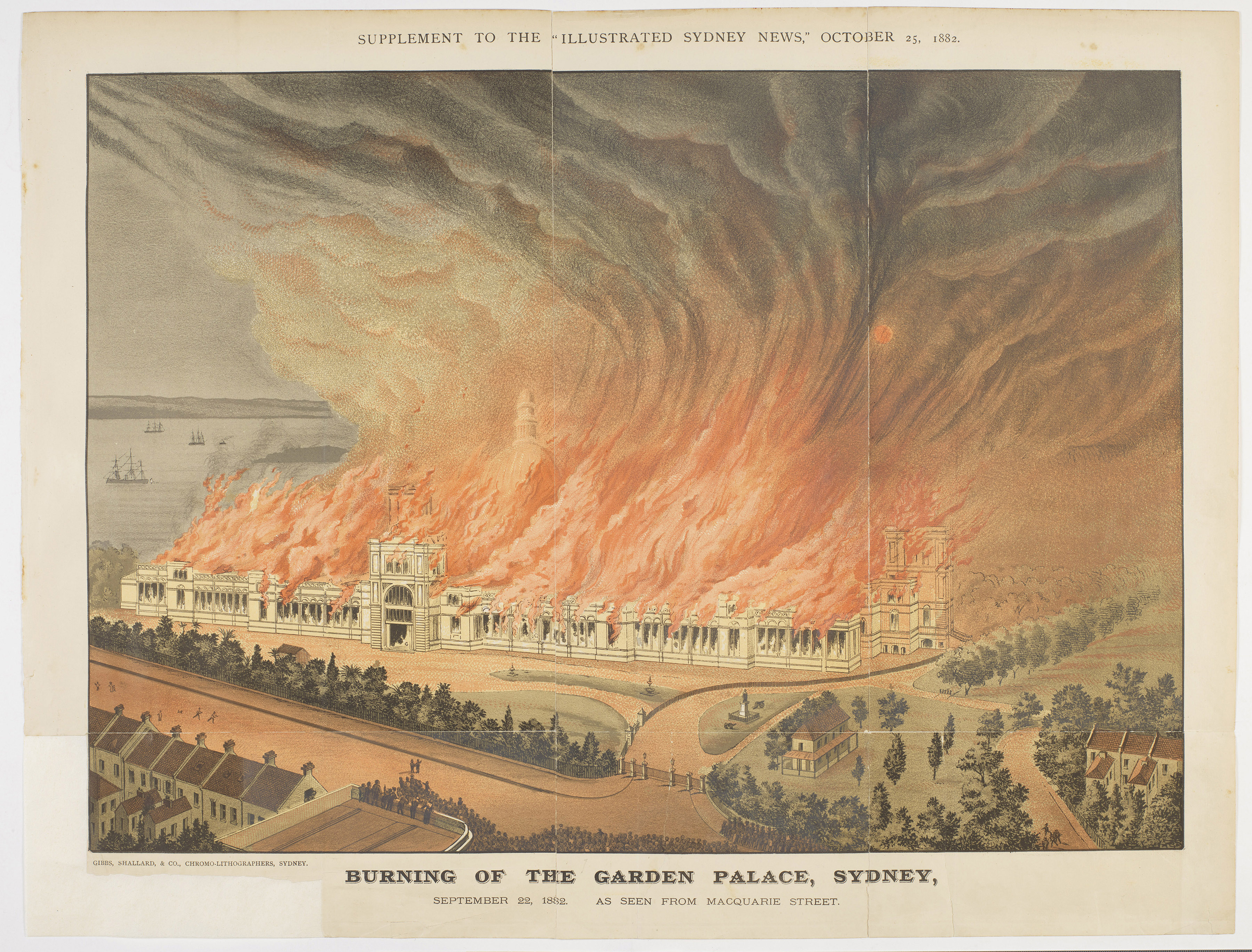 Burning of the Garden Palace, Sydney, September 22 1882, Supplement to the Illustrated Sydney News, October 25,1882; Sydney : engraved by Gibbs, Shallard and Co., 1872-1889, courtesy Mitchell Library, State Library of New South Wales