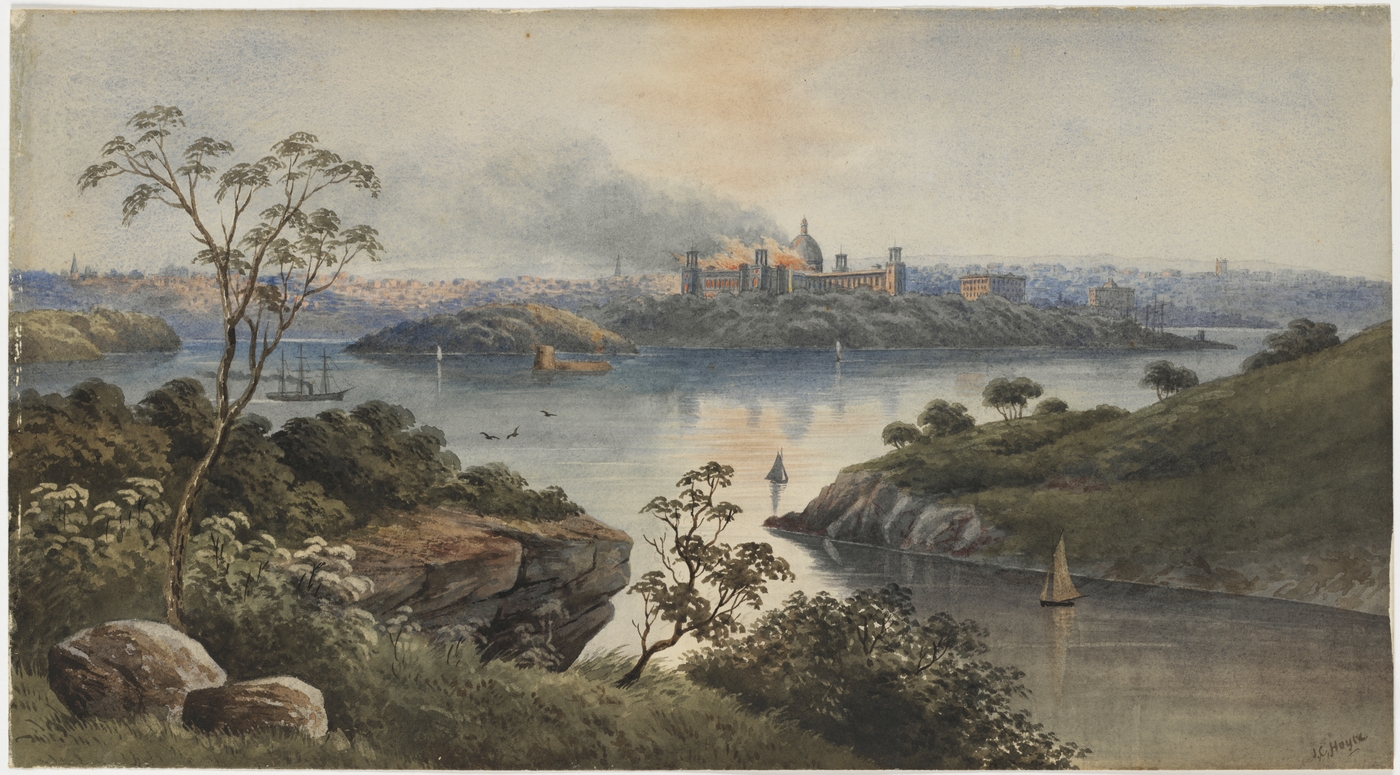 The Burning of the Garden Palace, seen from the North Shore, [1882] / by J. C. (John Clark) Hoyte, 1835-1913, courtesy