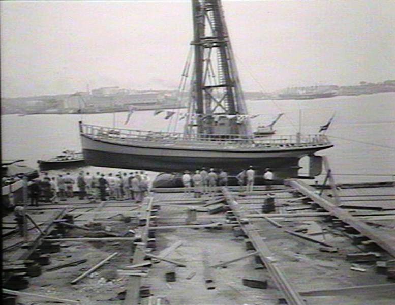 Launching of the Bennelong: Goat Island, 26.11.51, Government Printing Office 1 - 10055, courtesy State Library of NSW.