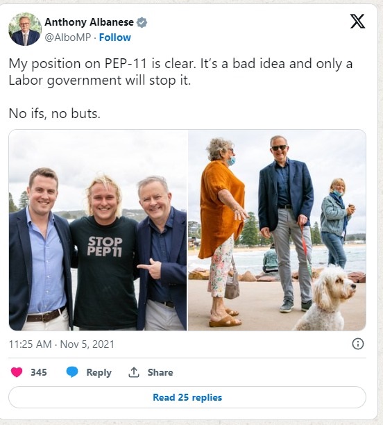 It should be remembered that current Australian Prime Minister Anthony Albanese also campaigned during the last federal lection on a platform of not supporting PEP-11:
