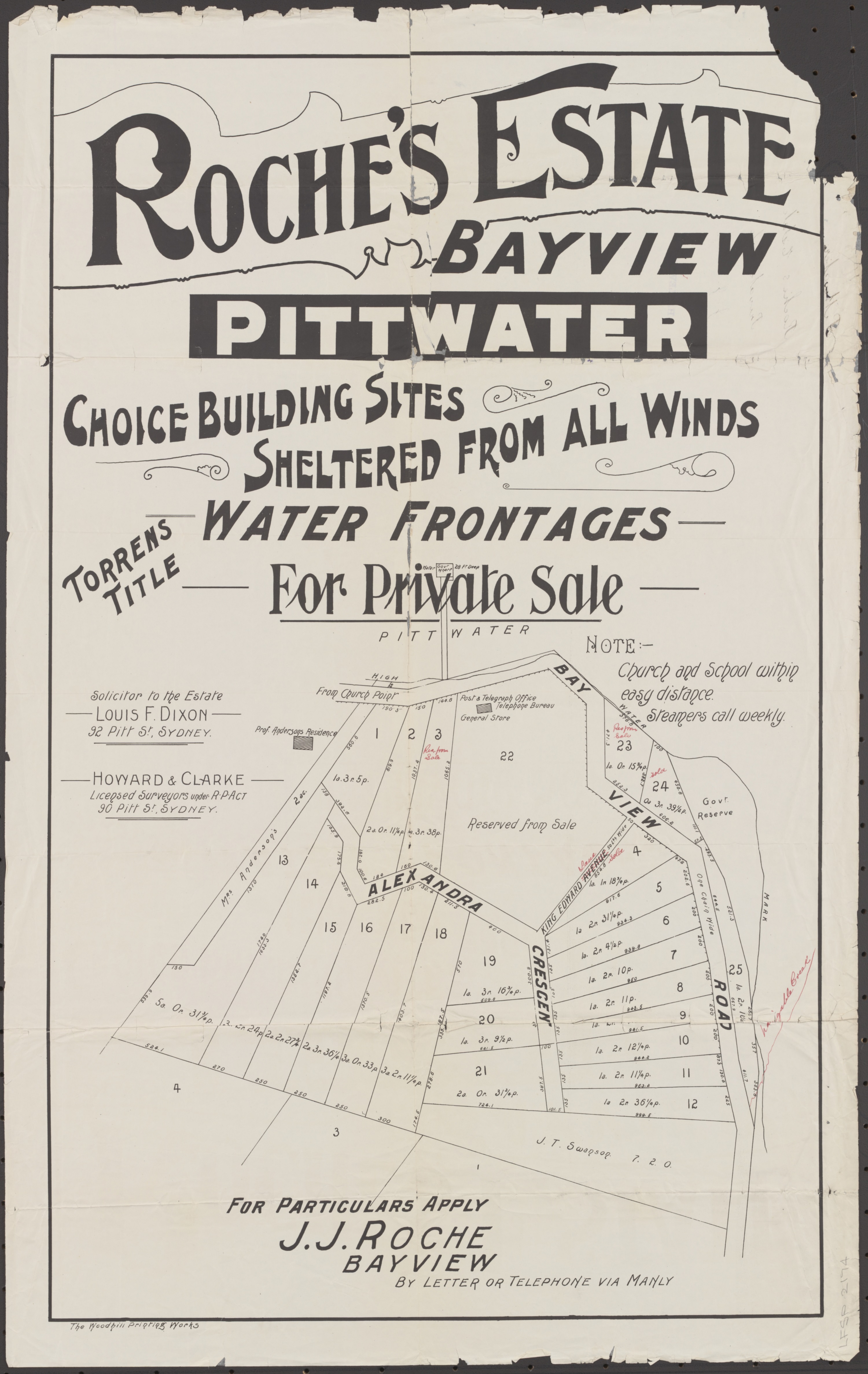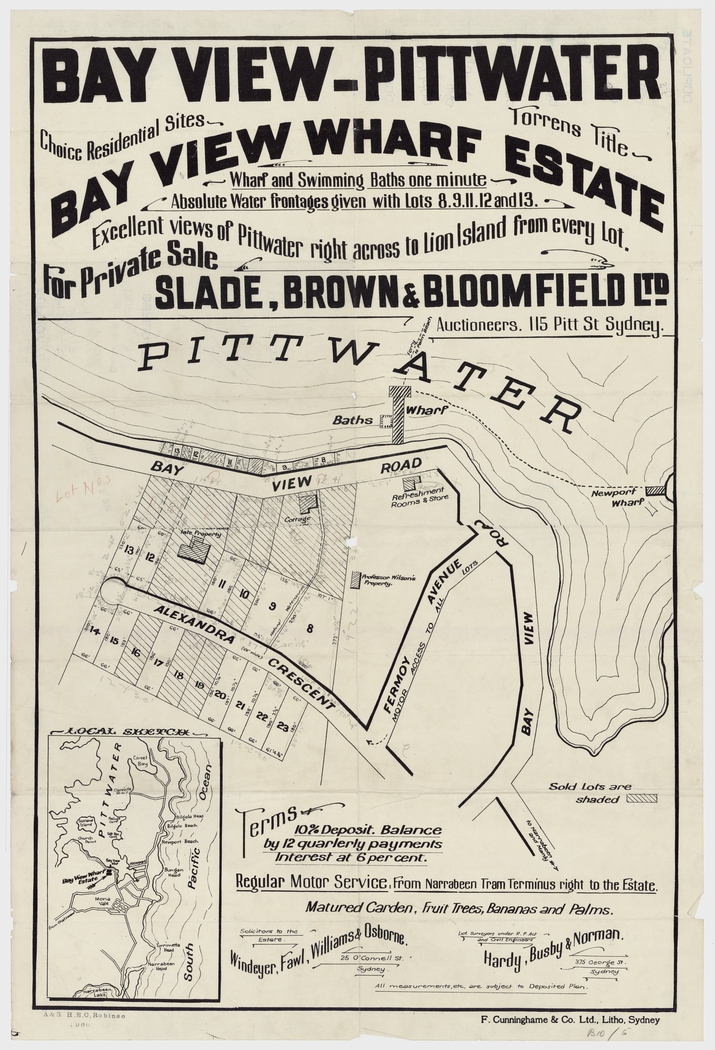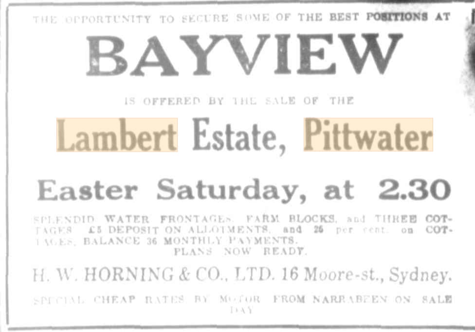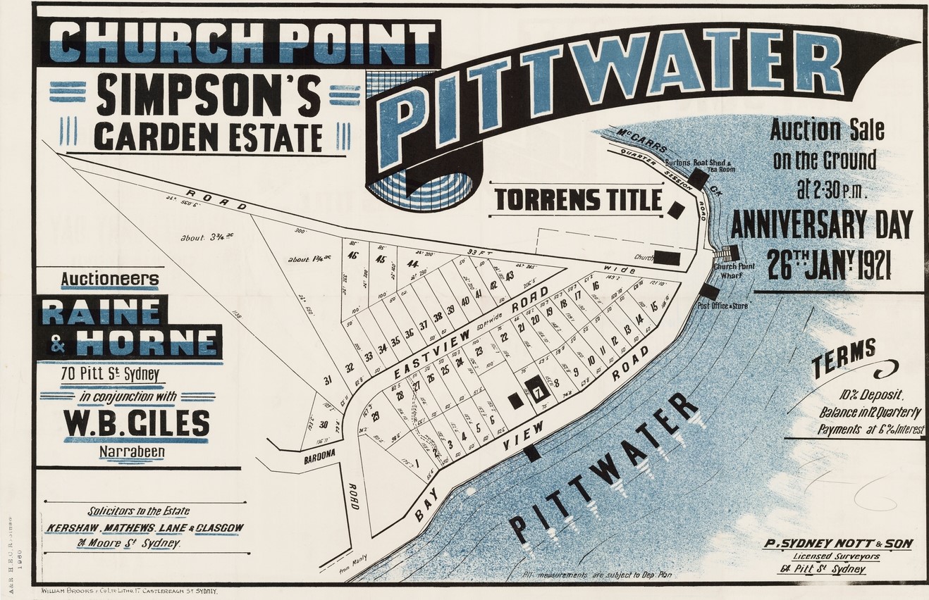 Many of these subdivision lithographs that are in what we today call Church Point were also named as being in 'Bay View' - even into the years where the name that was used to describe this outlook, in being a place of a bay with a view, became one word as 'Bayview' and the road, formerly known as the 'Bay View Road' was renamed as 'Pittwater' road from its juncture with the same at Mona Vale in 1951, while everything north of there then officially became the 'Barrenjoey' road after being for so long the 'road to Barrenjoey'. Early Bayview and Church Point overlap in the way they were named during subdivisions - with many named 'Bay View' in what is actually current day Church Point. Those in what we today call Church Point will run in the Church Point Street Names page to follow.