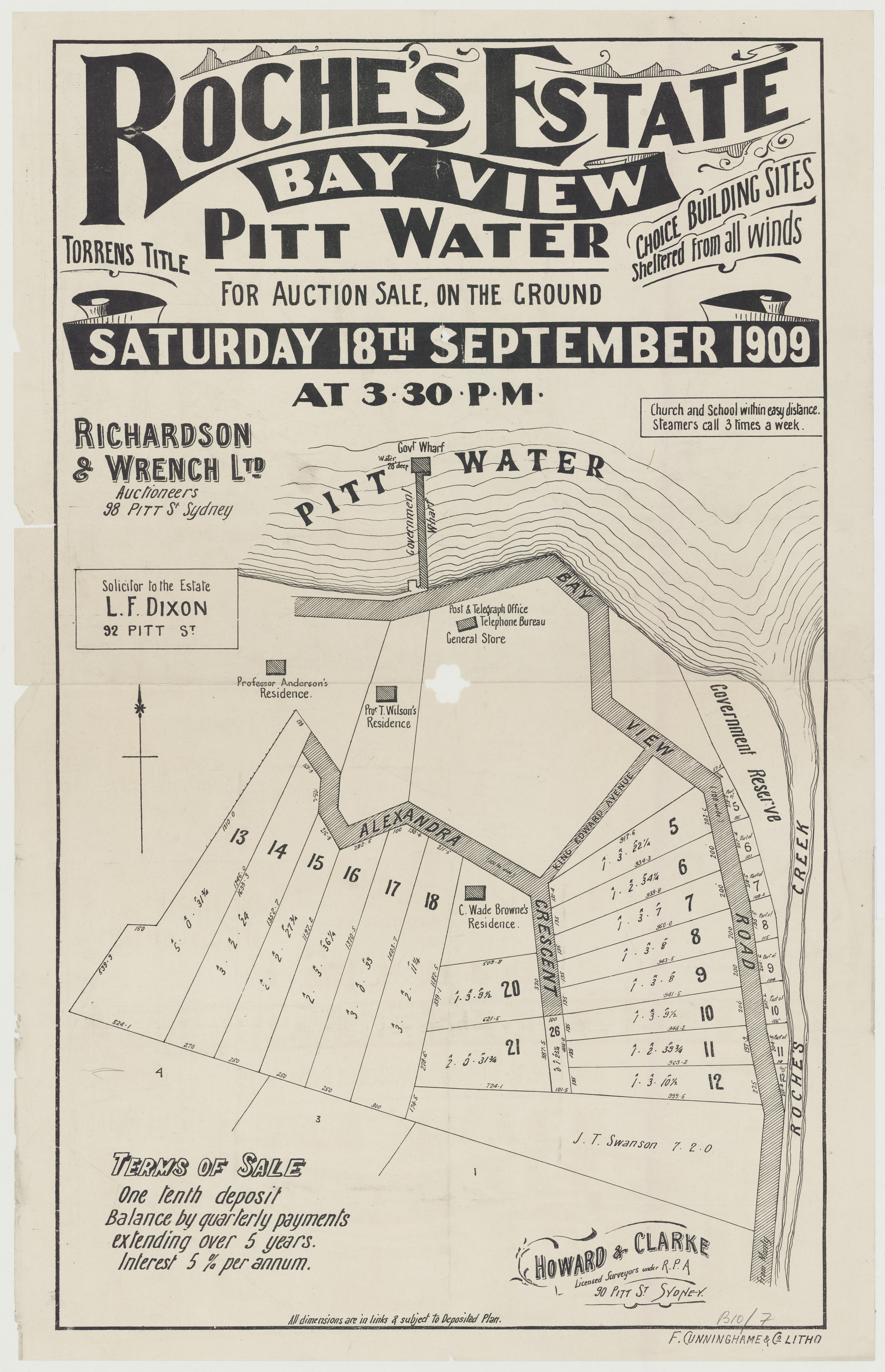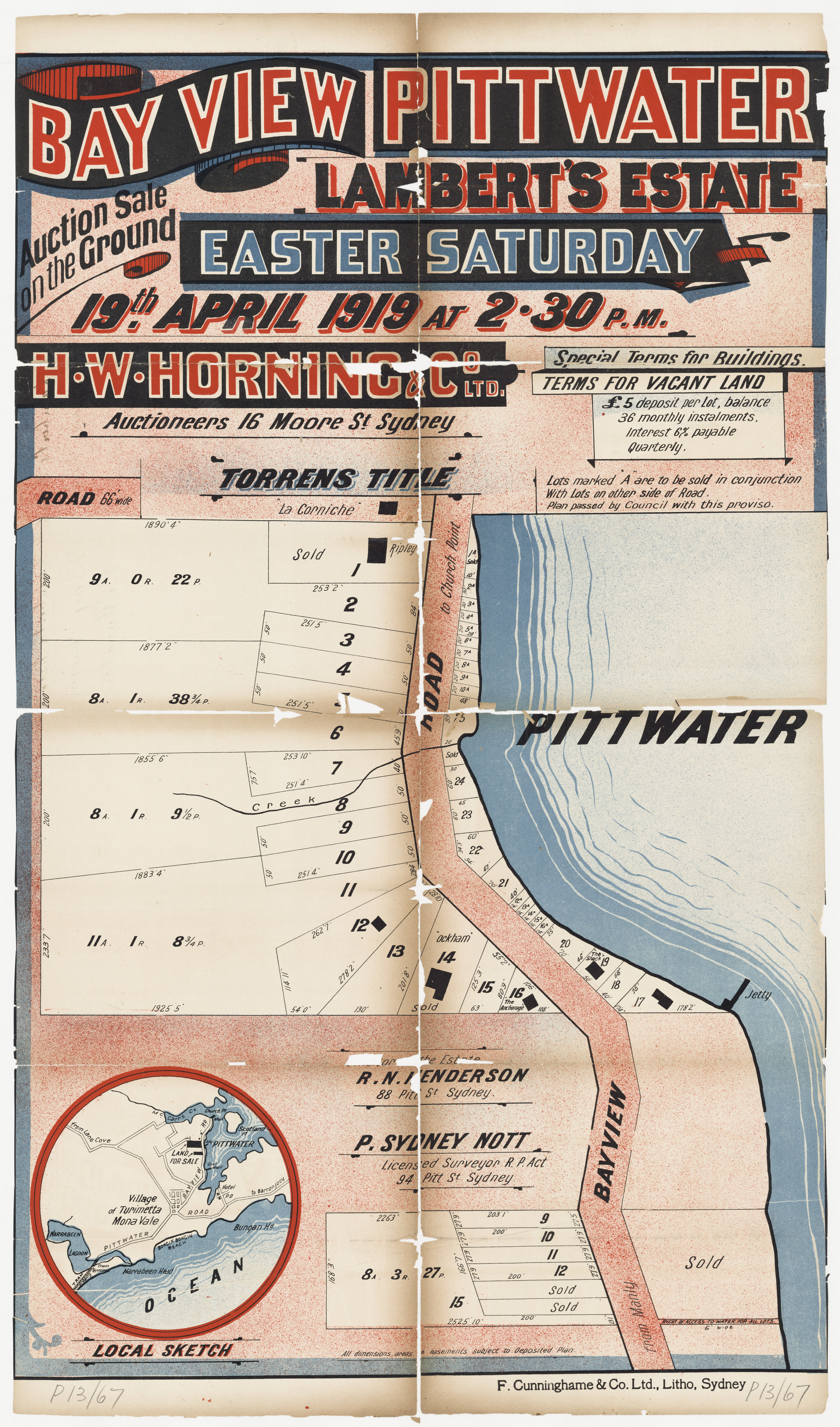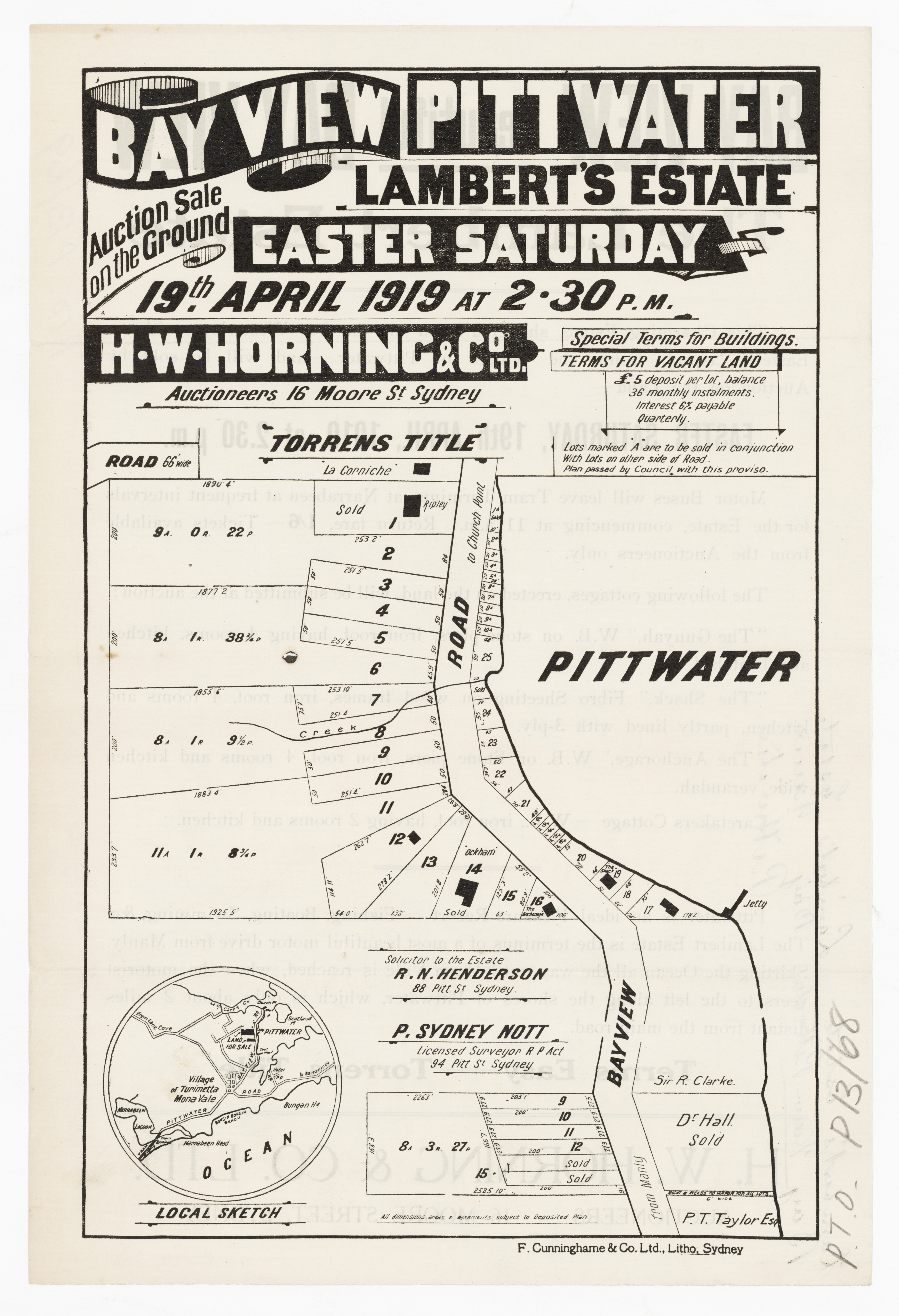 Many of these subdivision lithographs that are in what we today call Church Point were also named as being in 'Bay View' - even into the years where the name that was used to describe this outlook, in being a place of a bay with a view, became one word as 'Bayview' and the road, formerly known as the 'Bay View Road' was renamed as 'Pittwater' road from its juncture with the same at Mona Vale in 1951, while everything north of there then officially became the 'Barrenjoey' road after being for so long the 'road to Barrenjoey'. Early Bayview and Church Point overlap in the way they were named during subdivisions - with many named 'Bay View' in what is actually current day Church Point. Those in what we today call Church Point will run in the Church Point Street Names page to follow.