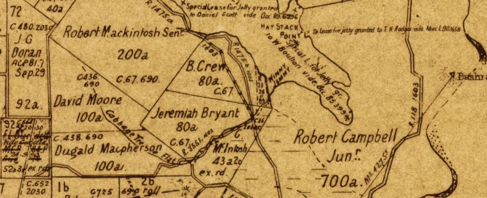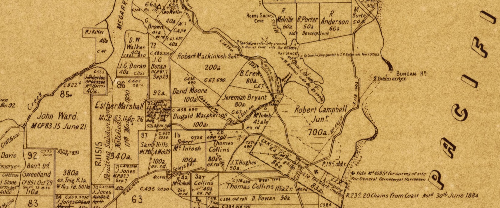Robert McIntosh Snr. died in 1829. His son and heir, Robert Jnr., who also had land holdings in Pittwater, later married and had 10 children, George being born on June 14, 1833. George McIntosh became a clergyman and lived at Narrabeen. He purchased the Winnererremy Swamp holding shown on the map above on November 27, 1874 for the sum of £43 10 shillings. George held the land for only 19 months before it was transferred to Robert McIntosh (it is not recorded whether this was his son or his brother of the same name). The 42 acres and 2 roods of swamp stayed in the family and on the death of Robert Edward McIntosh in January 1908, the land was inherited by Grace Jane and Edward Donald McIntosh.