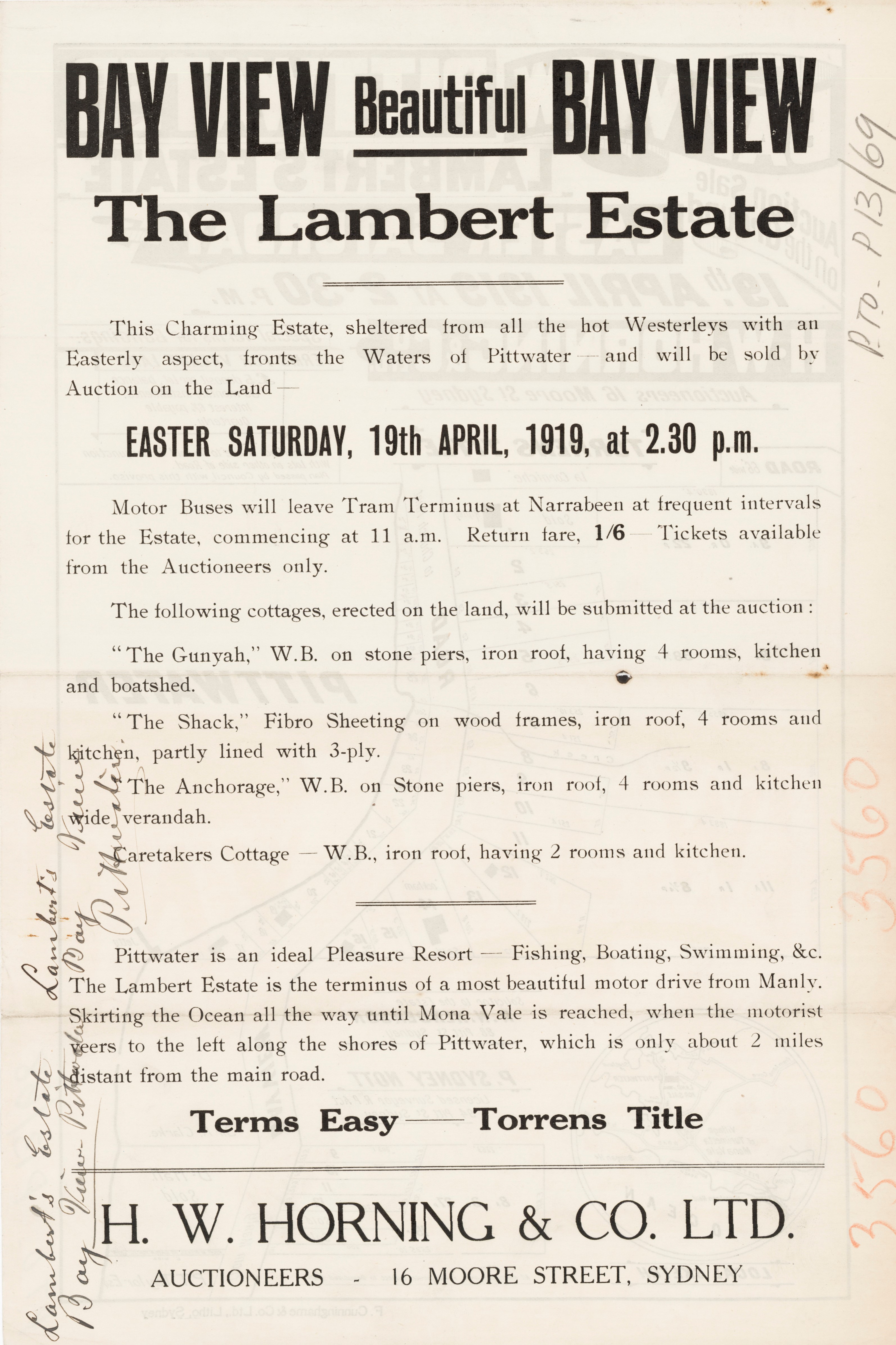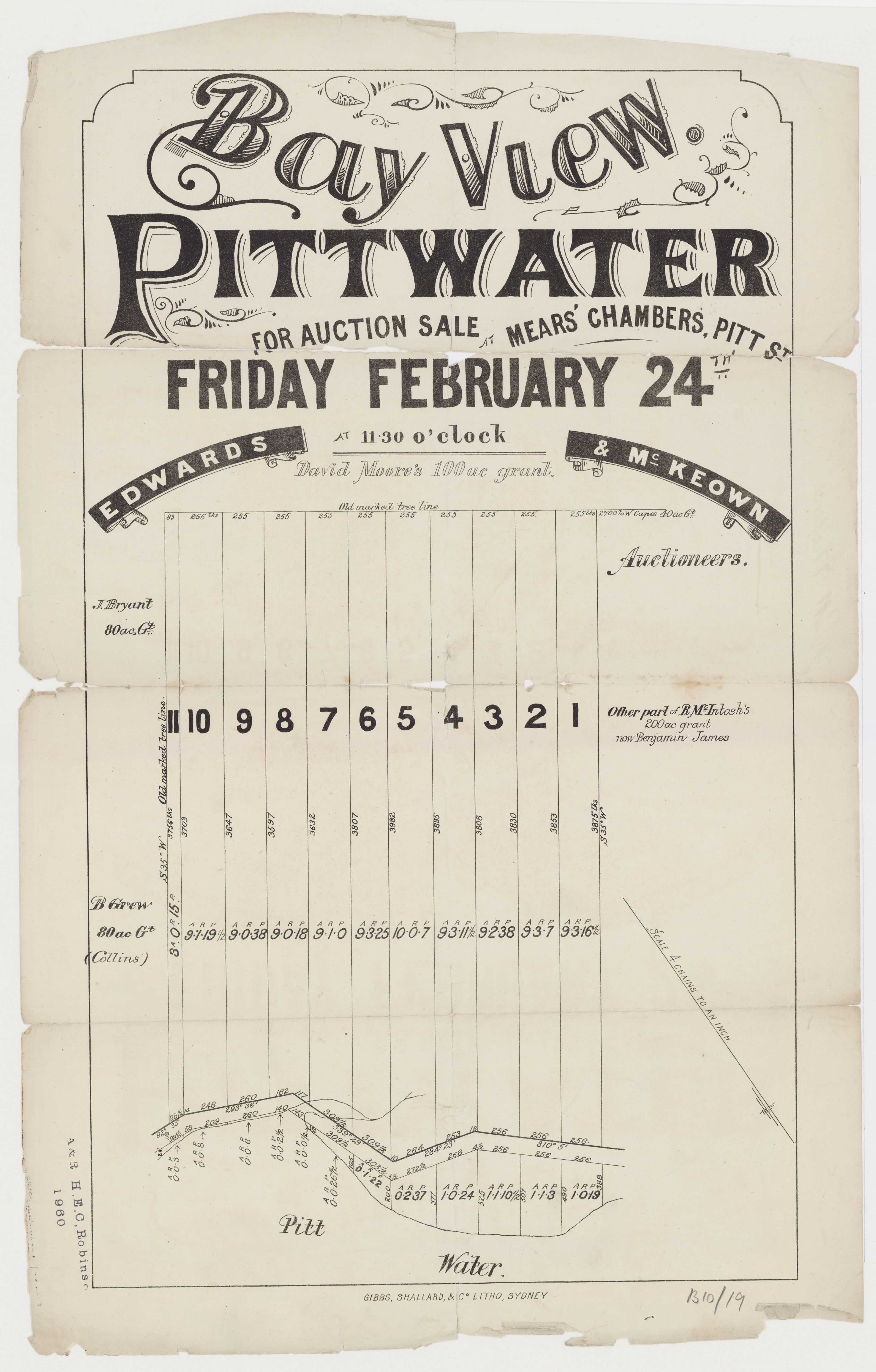 LOT 3. PITTWATER, BLOCK of LAND containing an area of about 17 1/2; acres, fronting the Bay, and close to the Post Office, upon which is erected a W. B. COTTAGE, containing 3 rooms, &c.