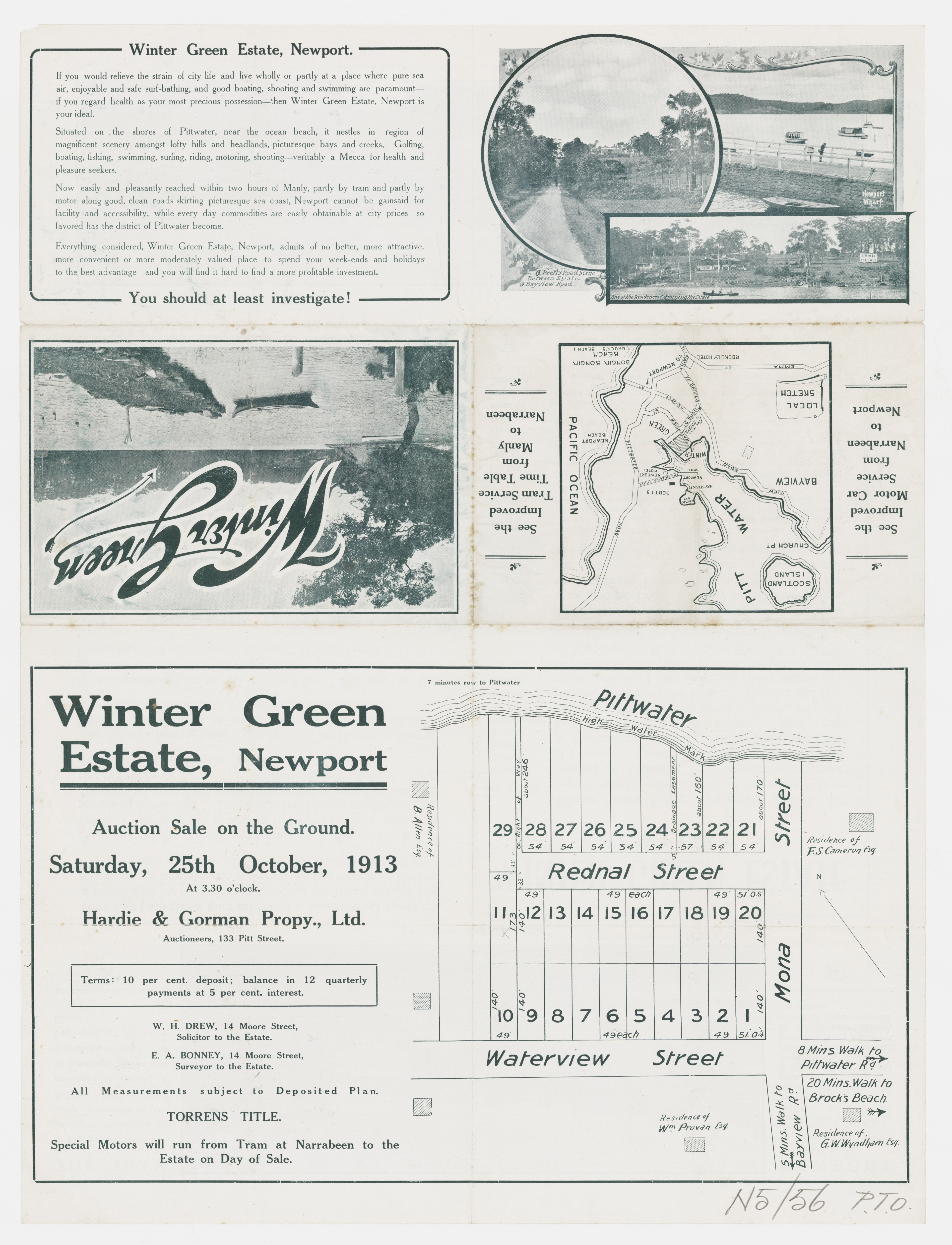 Right: Hardie & Gorman Pty. Ltd. Redman's Estate, Brookvale [cartographic material] : Pittwater Road, 3 miles from Manly Wharf : for auction sale 1901. MAP Folder 29, LFSP 382.Courtesy National Library of Australia