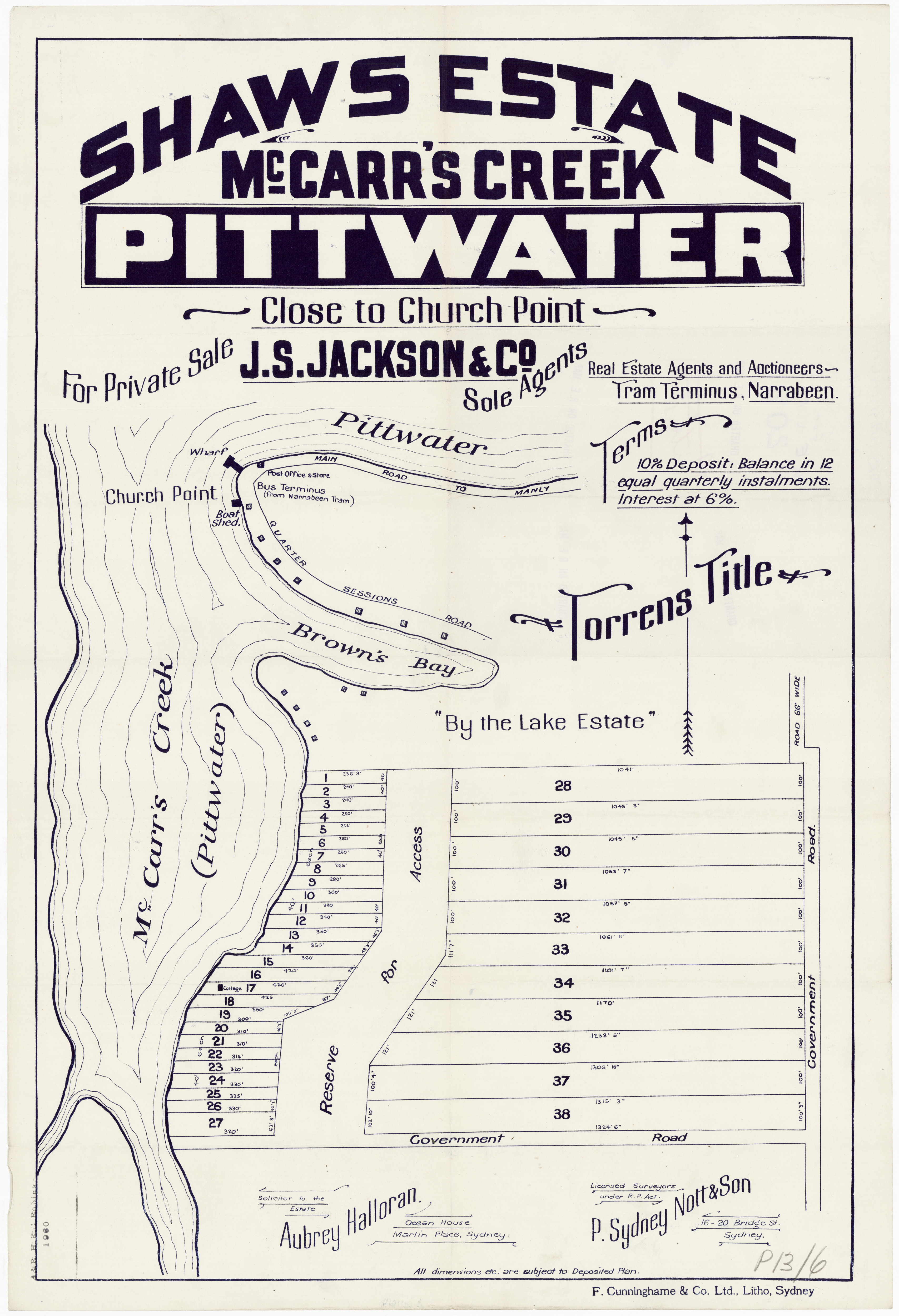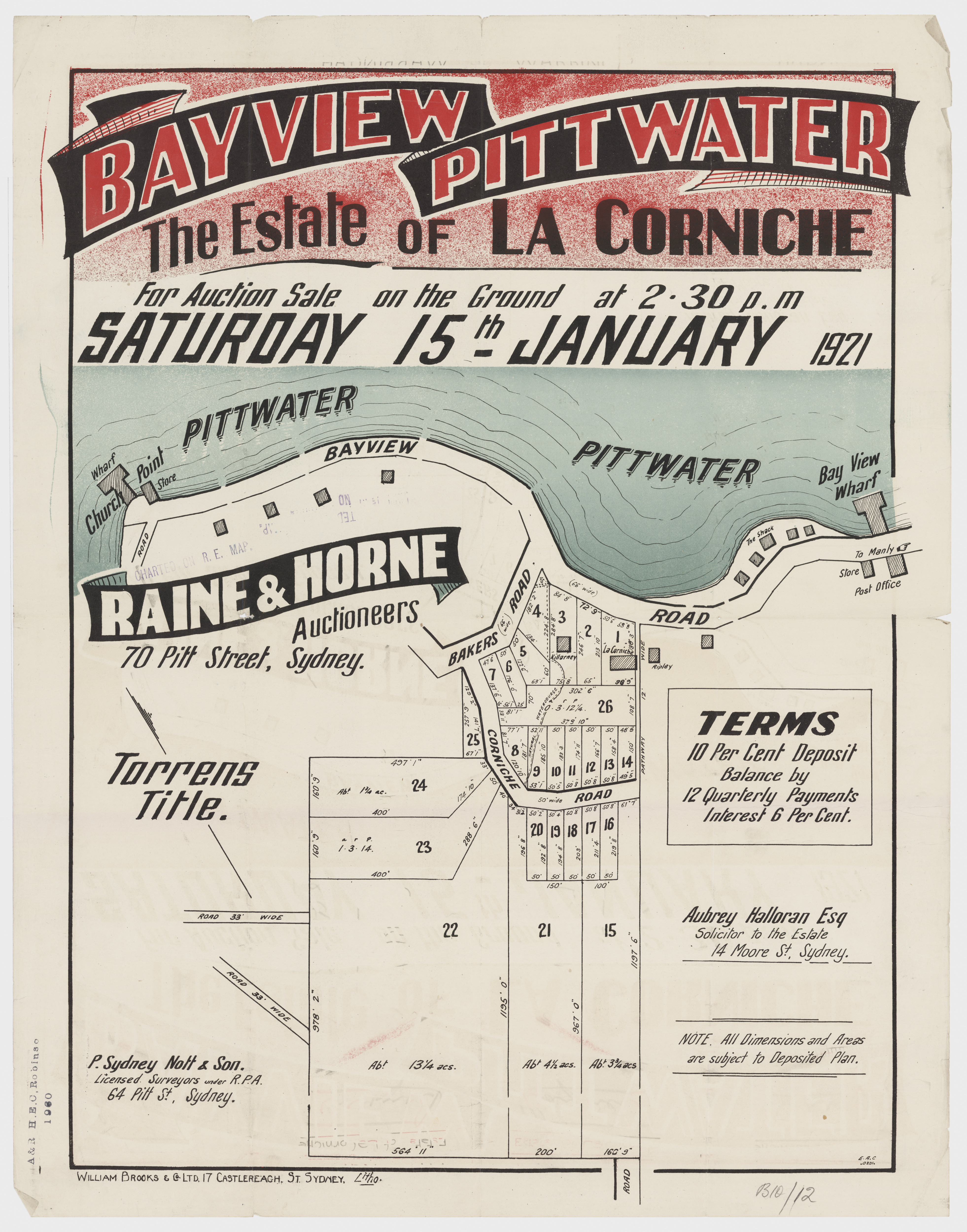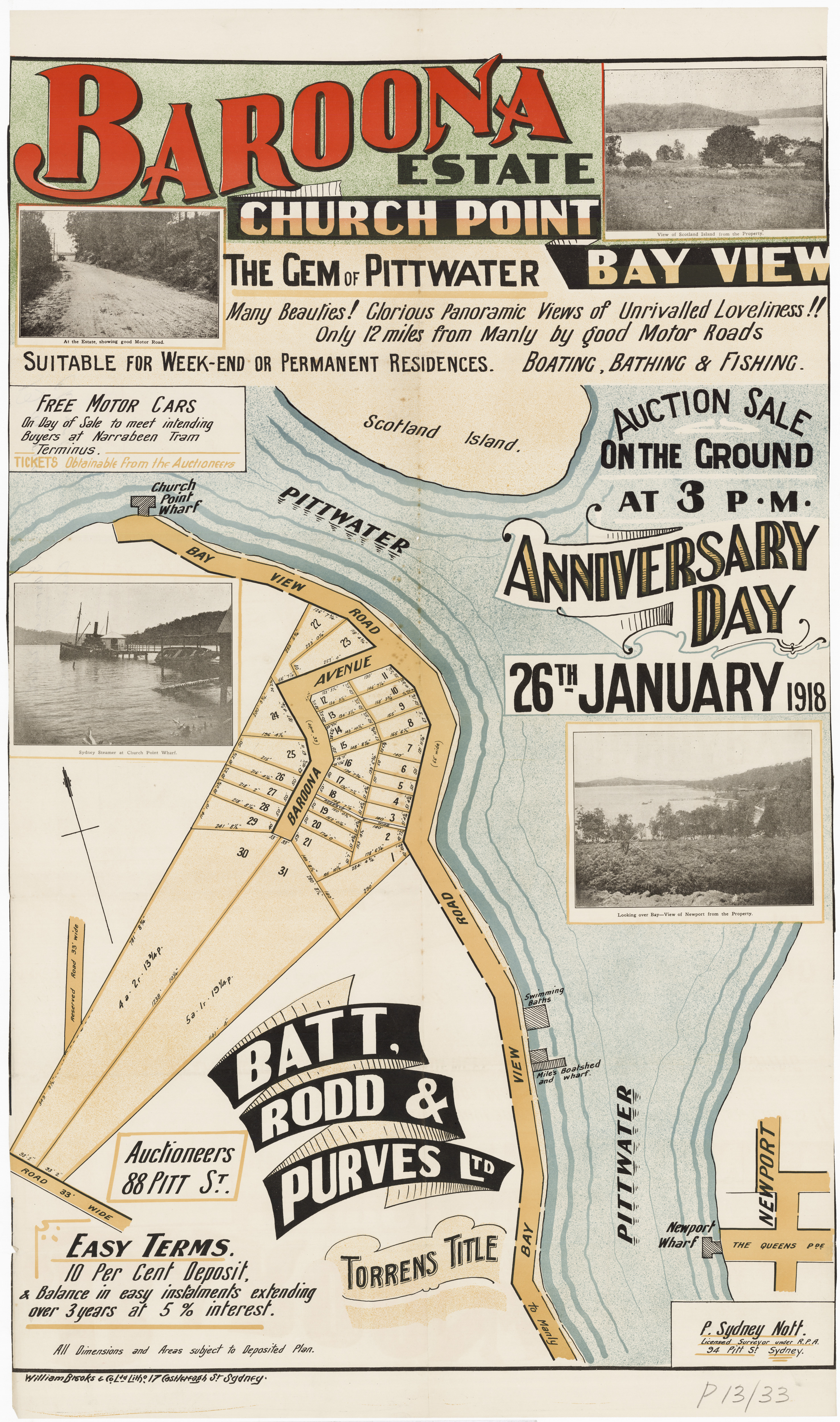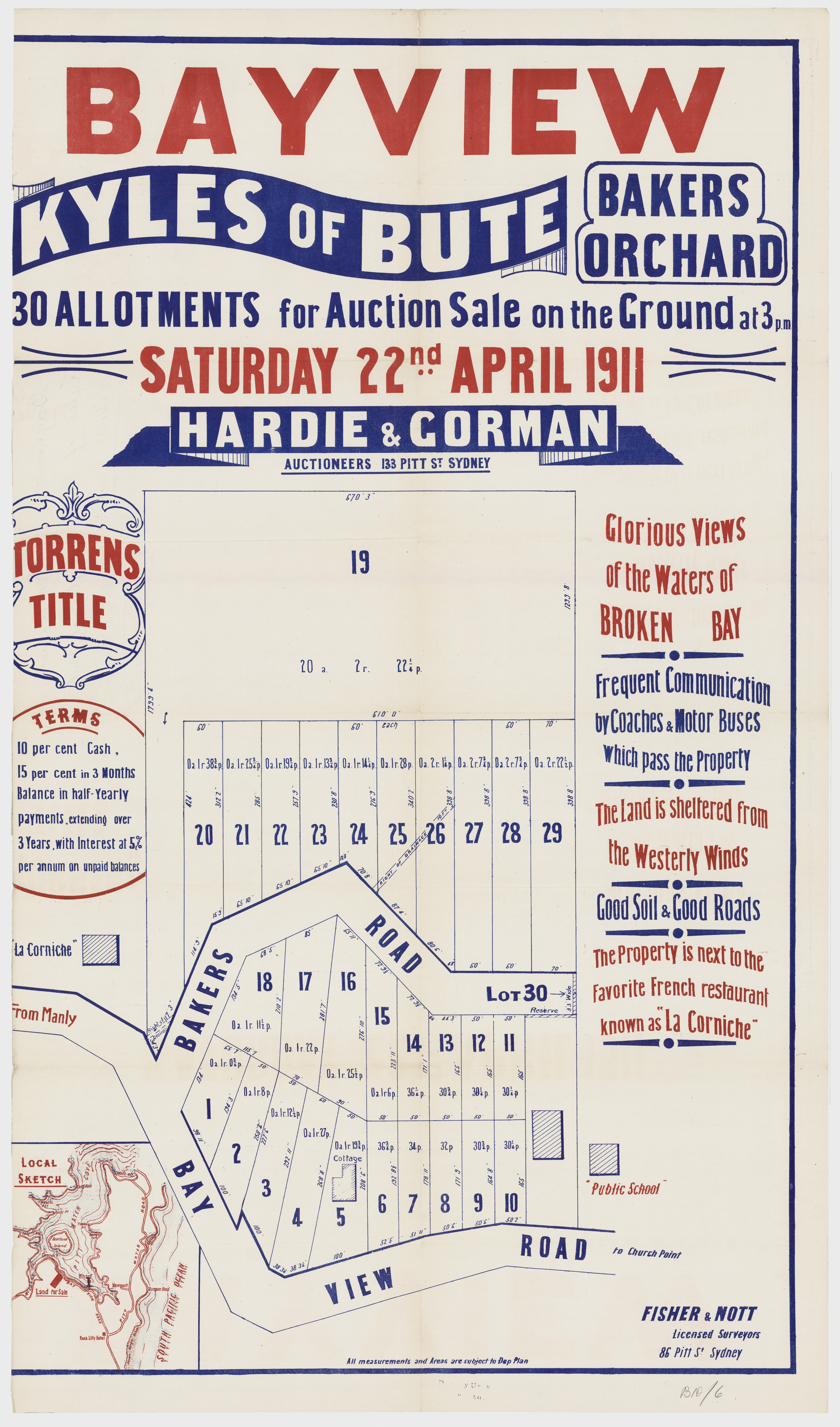 BY ORDER OF THE EXECUTORS THE ESTATE OF THE LATE MR. WILLIAM JOSEPH BAKER. ONE OF THE MOST CHARMING SPOTS AROUND SYDNEY. CHURCH POINT, PITTWATER. A pleasant Motor or Coach drive from Manly, through delightful and varied Scenery. SPLENDID SUBDIVISION BLOCK OF ABOUT 30 ACRES, PRACTICALLY A WATER FRONTAGE, with LARGE FRONTAGE to the MAIN ROAD, adjoining La Corniche, the well-known Accommodation House of Mons. Rainaud, and the old Public School, now the Property of Mr. Lesslie. The LAND is Fenced, and the improvements comprise old W.B. COTTAGE, with Iron Roof, containing Verandah, Hall, 6 Rooms, Kitchen, 2 Room's off, detached Stables, Shed, etc. There is an old Orchard of various Fruit Trees, and the Land is mostly nicely grassed, and divided into Paddocks. The Property is let on Lease till 1st July out to Mons. Rainaud. THE VIEWS ARE SUPERB, and embrace Pittwater, Scotland Island, Newport, etc