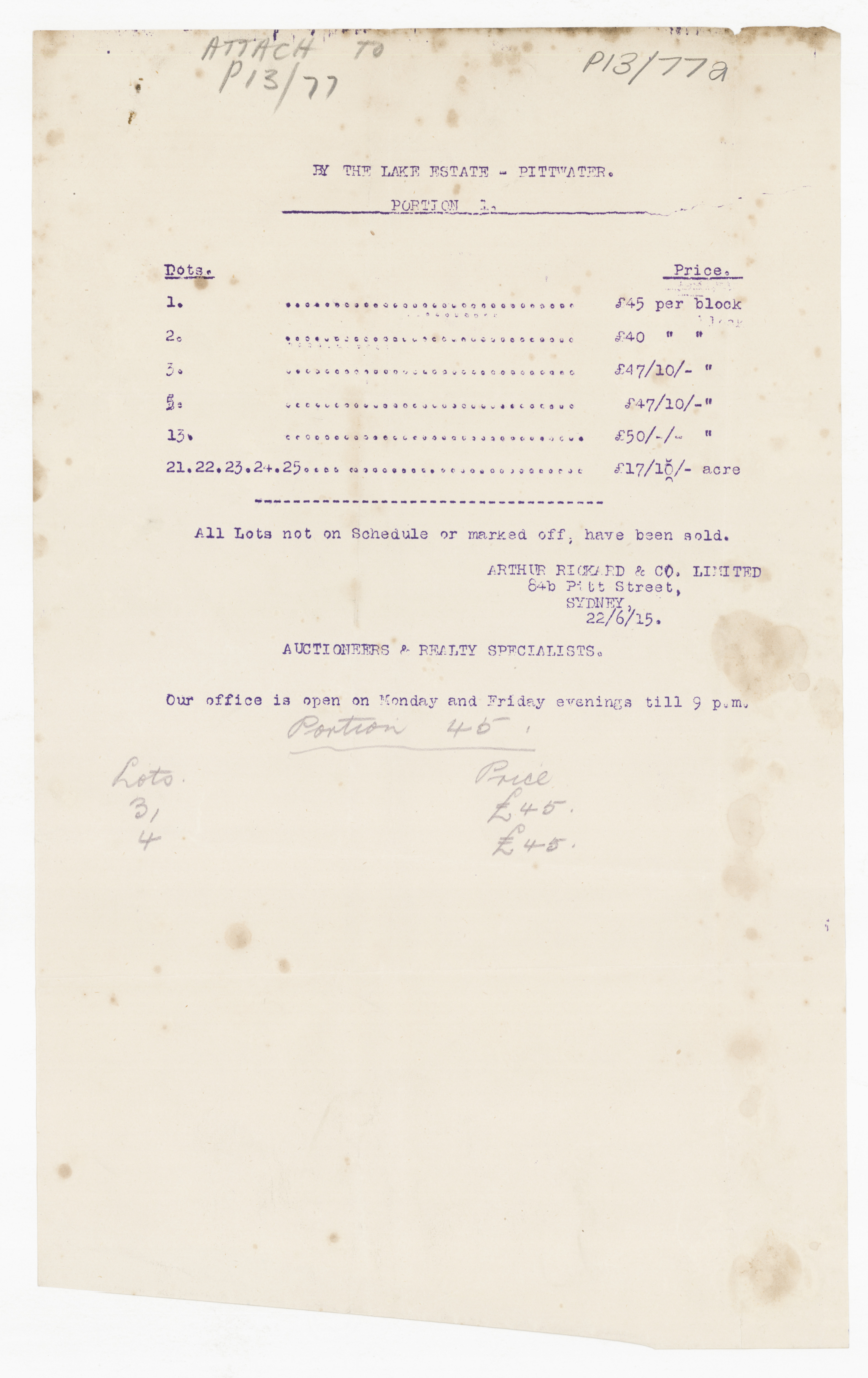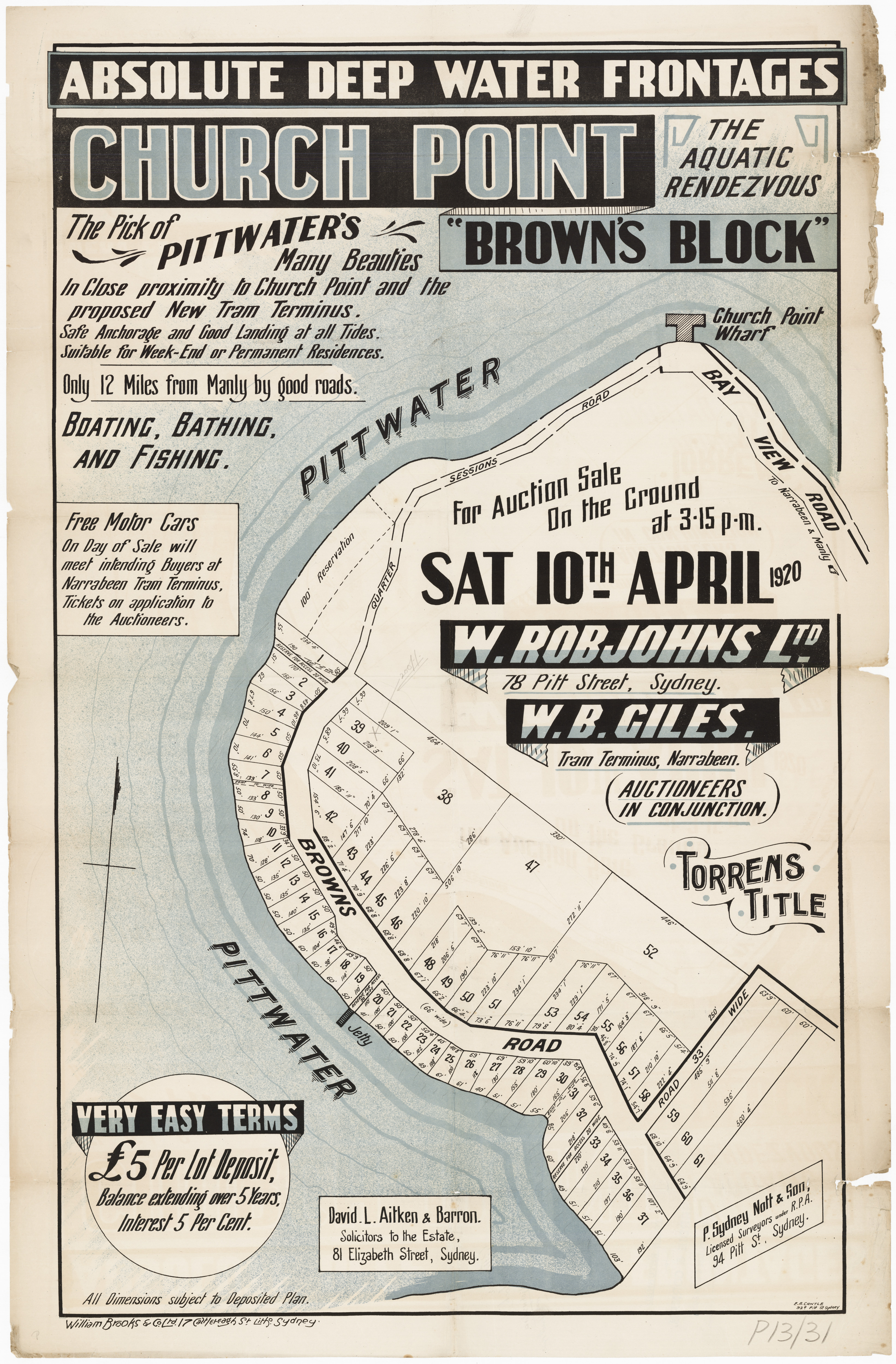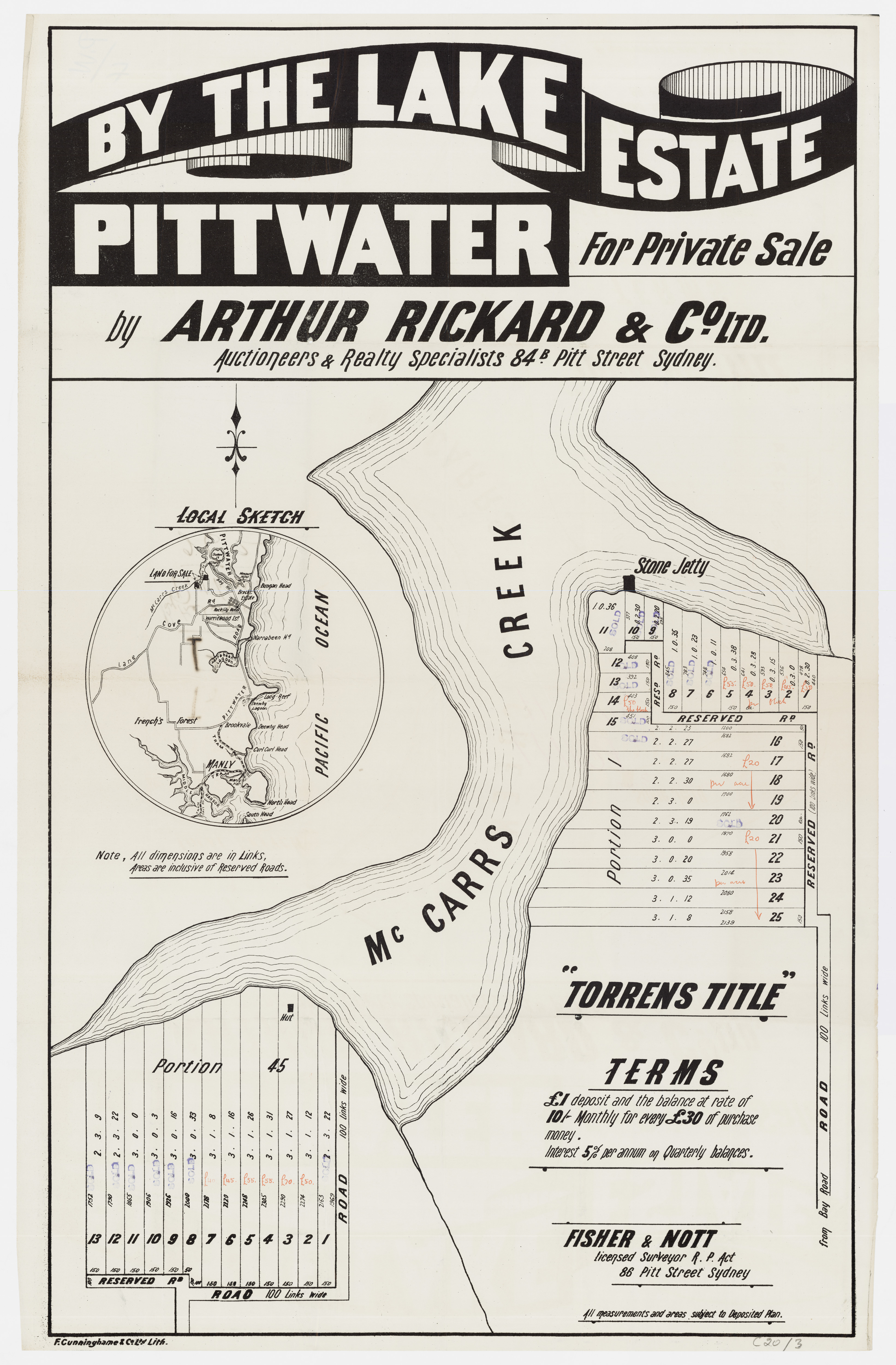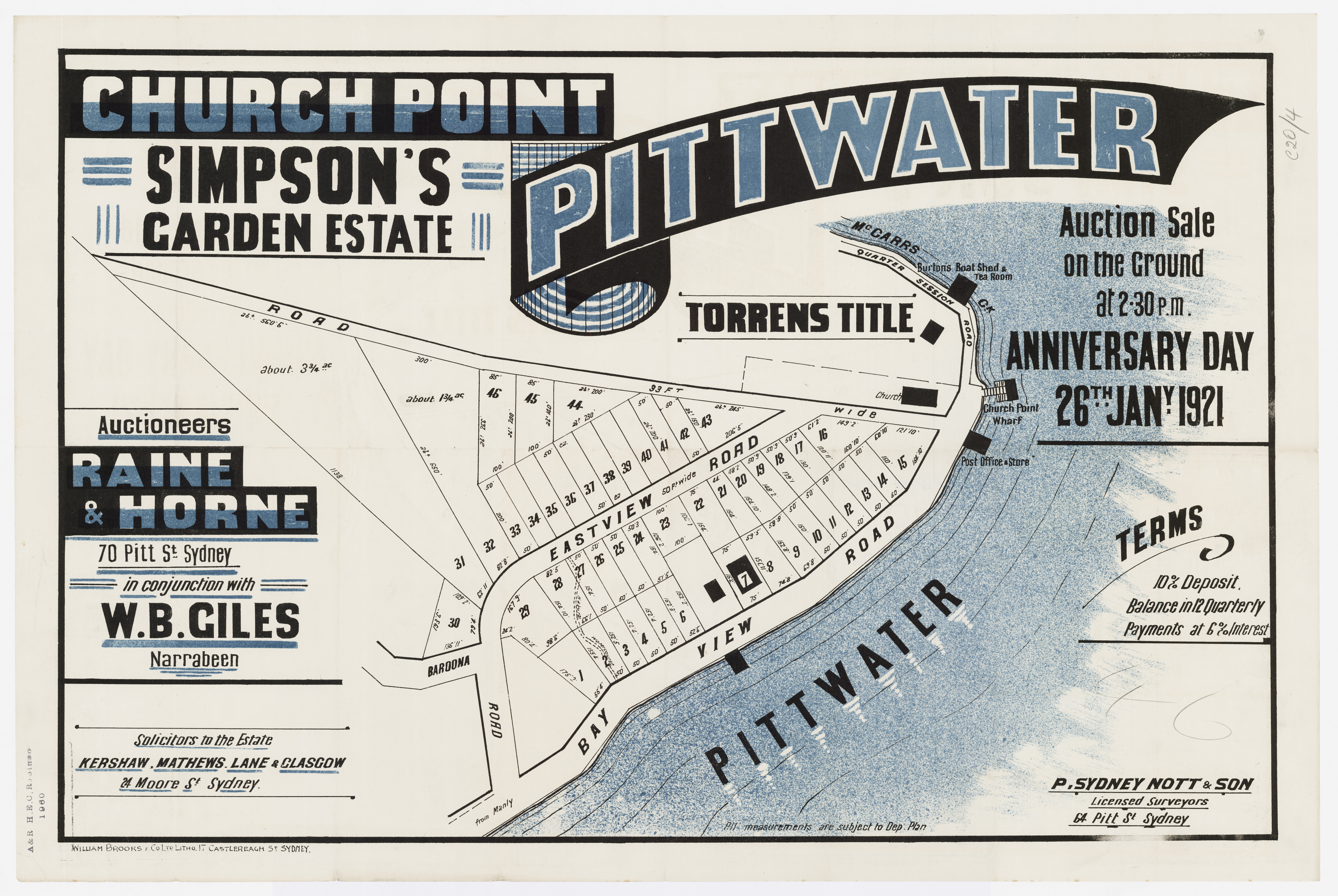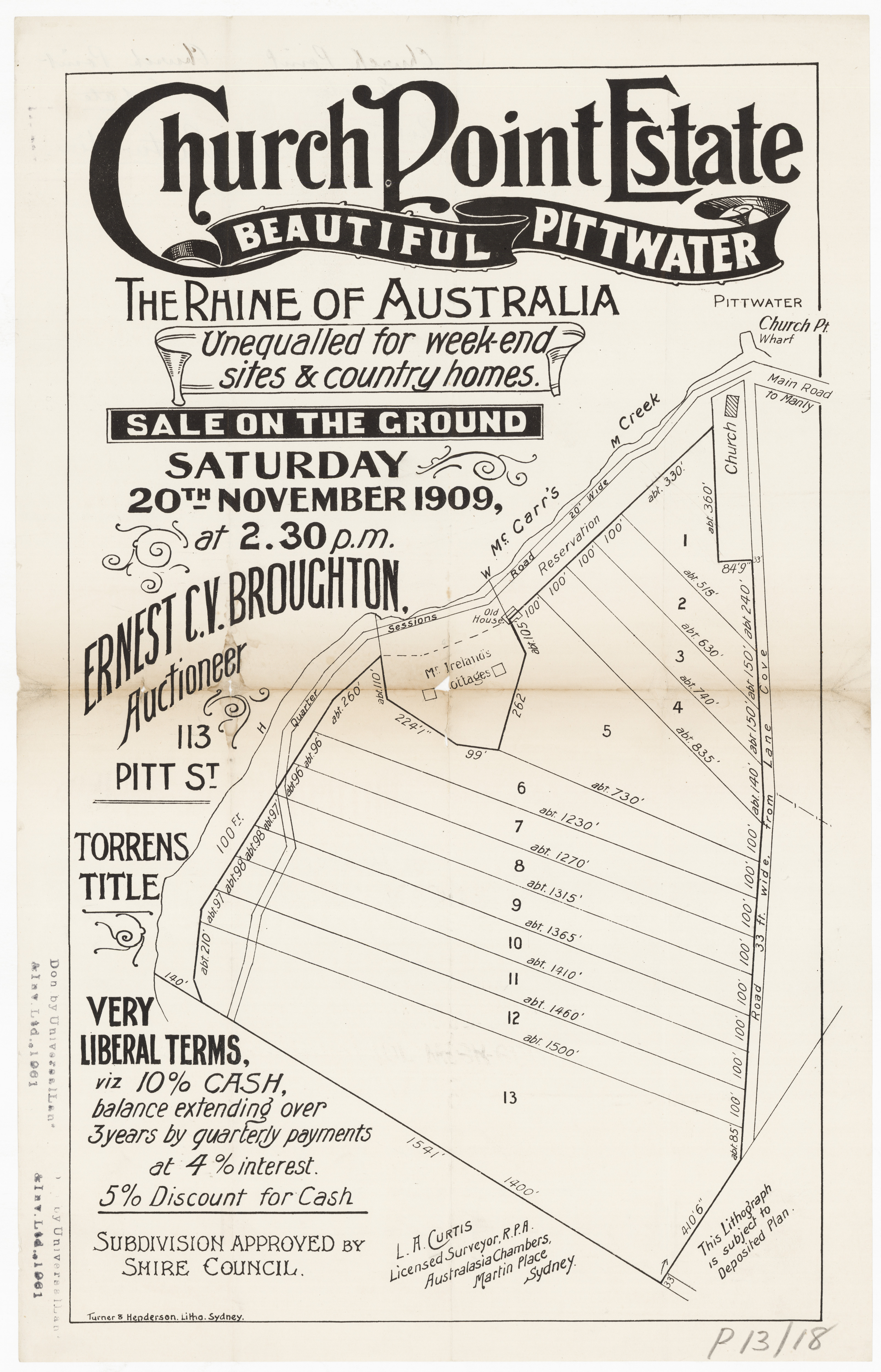 BY ORDER OF THE EXECUTORS THE ESTATE OF THE LATE MR. WILLIAM JOSEPH BAKER. ONE OF THE MOST CHARMING SPOTS AROUND SYDNEY. CHURCH POINT, PITTWATER. A pleasant Motor or Coach drive from Manly, through delightful and varied Scenery. SPLENDID SUBDIVISION BLOCK OF ABOUT 30 ACRES, PRACTICALLY A WATER FRONTAGE, with LARGE FRONTAGE to the MAIN ROAD, adjoining La Corniche, the well-known Accommodation House of Mons. Rainaud, and the old Public School, now the Property of Mr. Lesslie. The LAND is Fenced, and the improvements comprise old W.B. COTTAGE, with Iron Roof, containing Verandah, Hall, 6 Rooms, Kitchen, 2 Room's off, detached Stables, Shed, etc. There is an old Orchard of various Fruit Trees, and the Land is mostly nicely grassed, and divided into Paddocks. The Property is let on Lease till 1st July out to Mons. Rainaud. THE VIEWS ARE SUPERB, and embrace Pittwater, Scotland Island, Newport, etc