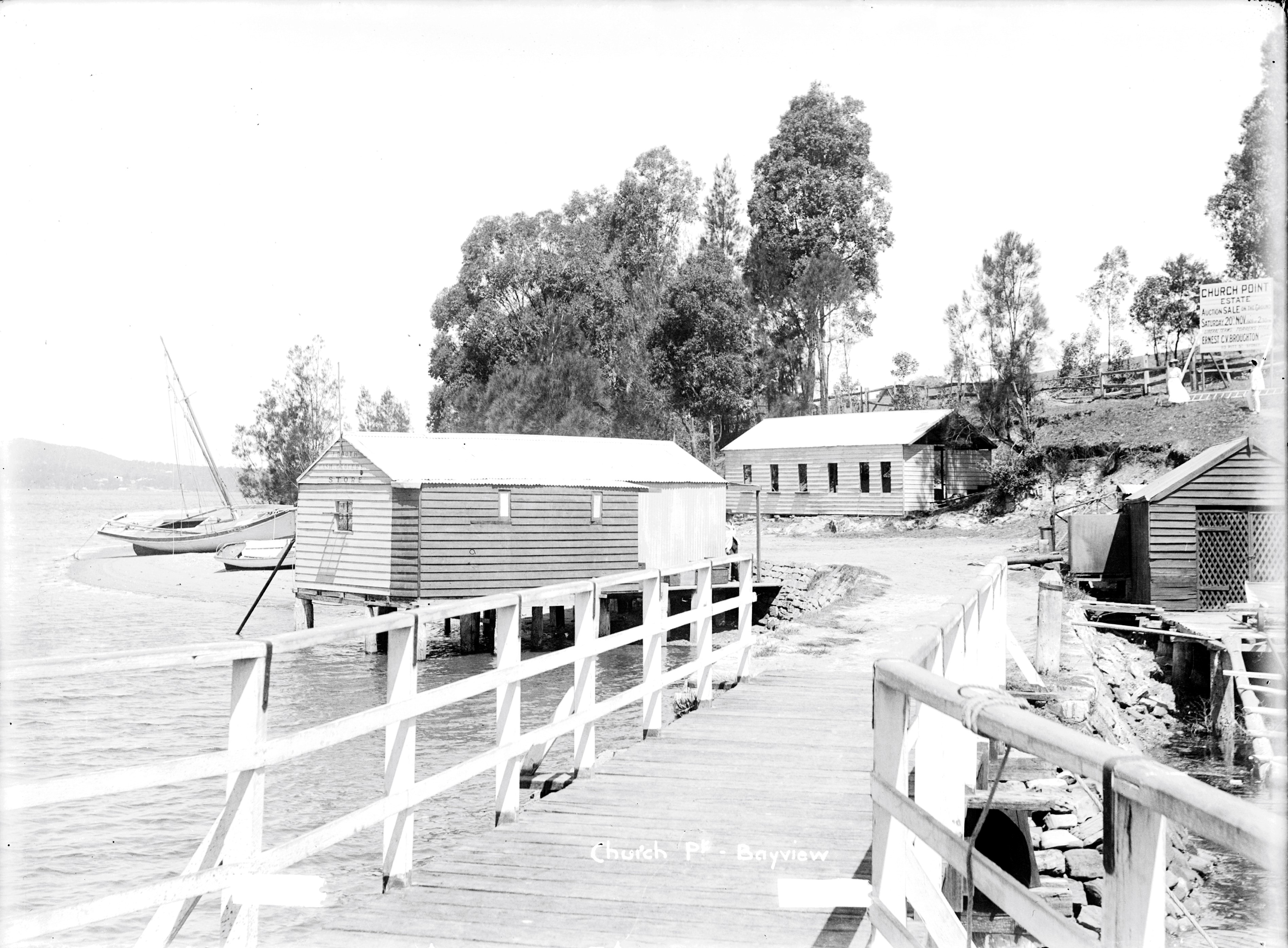 Church Point derives its name from the little wooden house of worship erected about the year 1872 on the hill slope just above the wharf. In the cemetery lie two of the Oliver family, who passed away over 40 years ago. They were among the earliest inhabitants of Pittwater, when the blacks still lived in the fastnesses of Kuring-gai Chase. Such places enkindle in one's memory the lines of Gray's Elegy: —