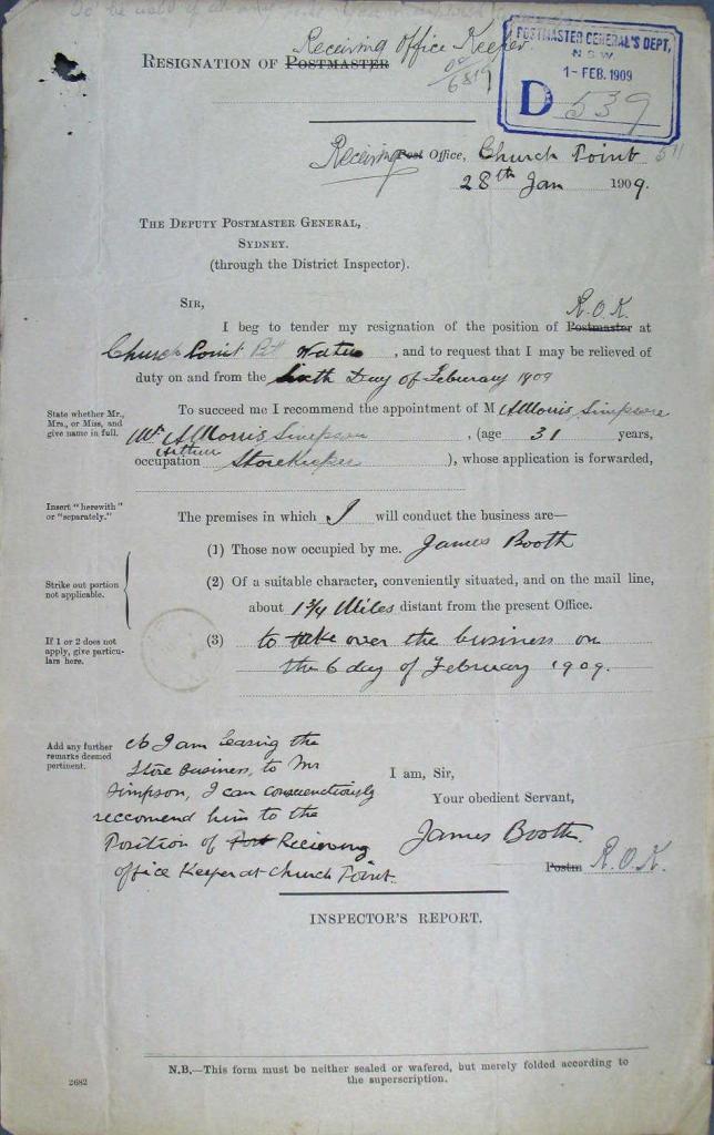 Named ‘Melrose’ by 1906 the premises was then run by a Mrs Friend, in 1908 by A R Huntley, who was also Postmaster or Receiving Officer Keeper at Church Point until 'having to leave the premises' in December 1908 - it then became the A M Simpson place.