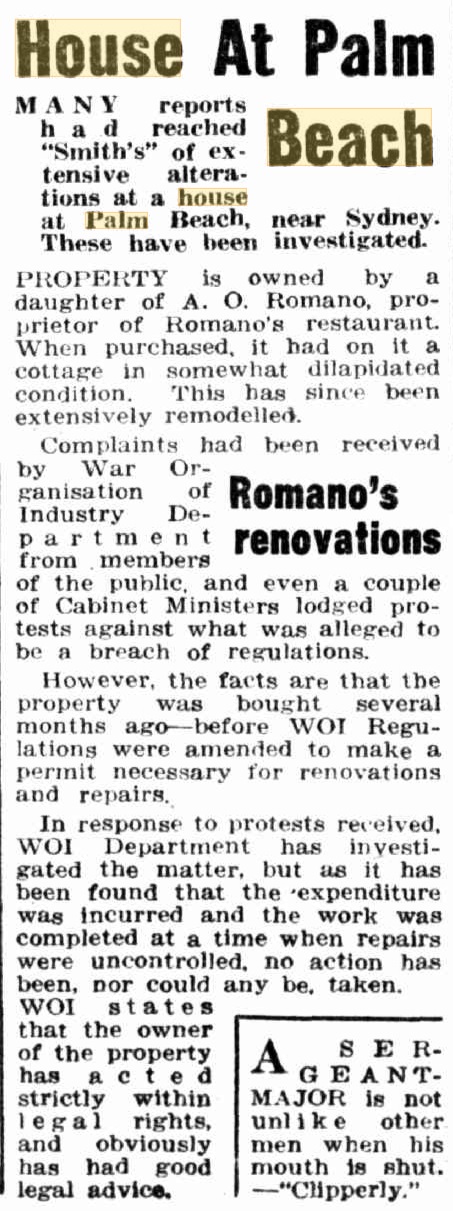 "We don't like It at any price," said Mrs. S. B. Hooper, secretary of Palm Beach Progress Association. Land values, she added, would slump Immediately, and Palm Beach would become a commercialised business place, losing all the natural beauty and isolation that has made It an attractive holiday resort. BARRENJOEY PROJECT (1938, August 1). The Sun (Sydney, NSW : 1910 - 1954), p. 3 (LATE FINAL EXTRA). Retrieved from http://nla.gov.au/nla.news-article229128008