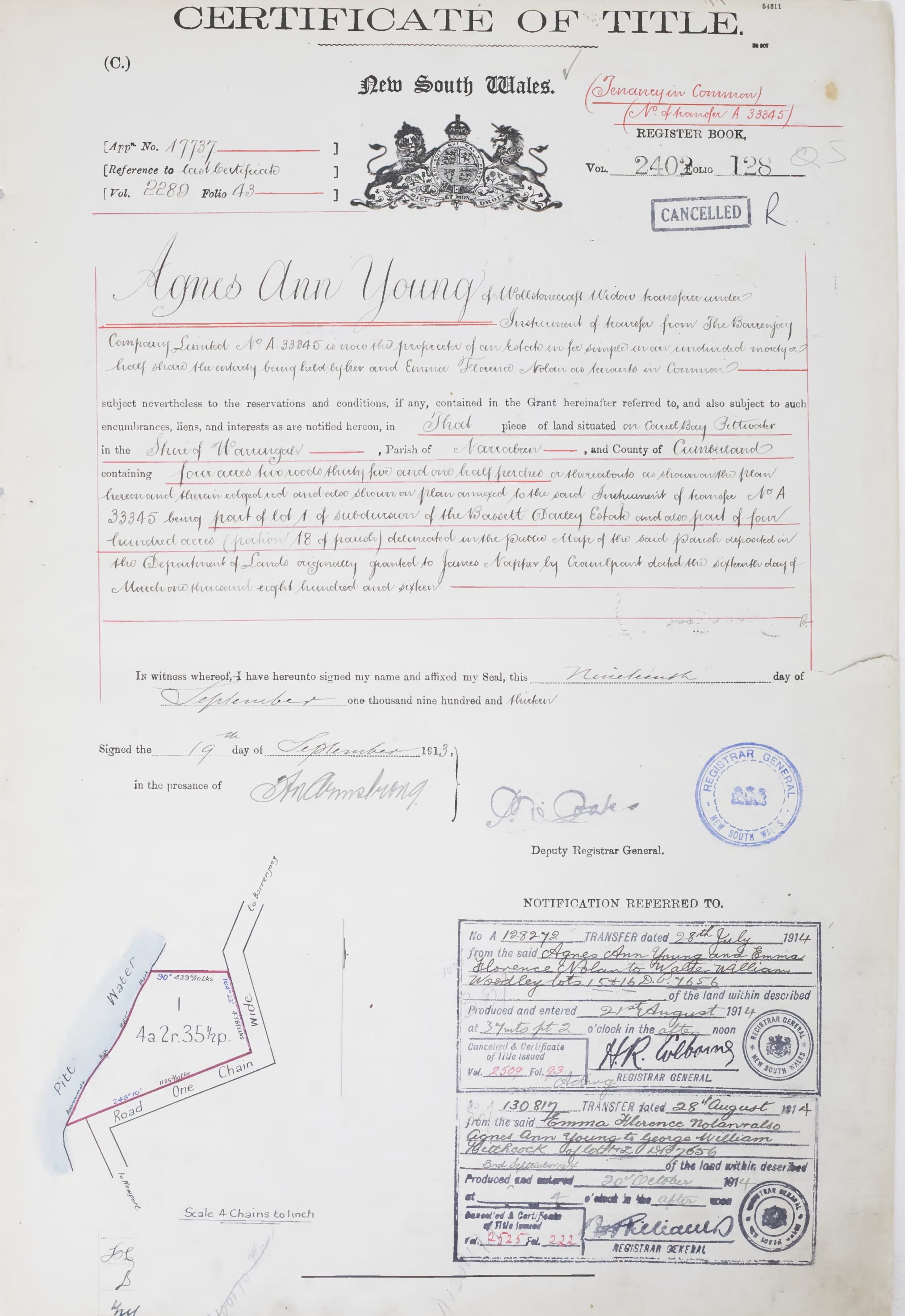 In June 1911, just after the tramline to Brookvale opened, a group of businessmen registered the 'Barranjoey Company', and led by John Ralston, succeeded in purchasing the Bassett-Darley Barrenjoey acreage. Some sources state they paid a whopping £500 - the proprietors apparently wanted at least £1900.00 but settled for what they could get.: