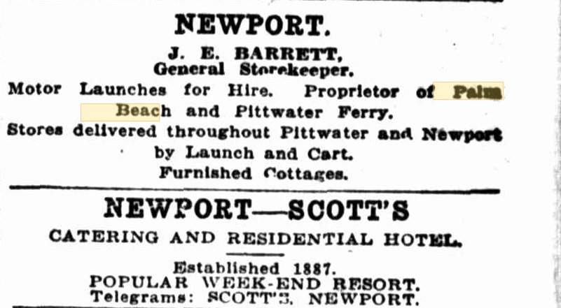 PALM BEACH.-Accommodation, 2 minutes surf beach, Golfing, fishing. Mrs. Garner and Miss Bruggen, Kookaburra, Florida-rd (late Sunrise). T., P.B. 31. PALM BEACH,-furnished Cottages to Let and For Sale Gow and Howlett. Store. Phone. 21. Advertising. (1922, March 4). The Sydney Morning Herald(NSW : 1842 - 1954), p. 3. Retrieved from http://nla.gov.au/nla.news-article28086268
