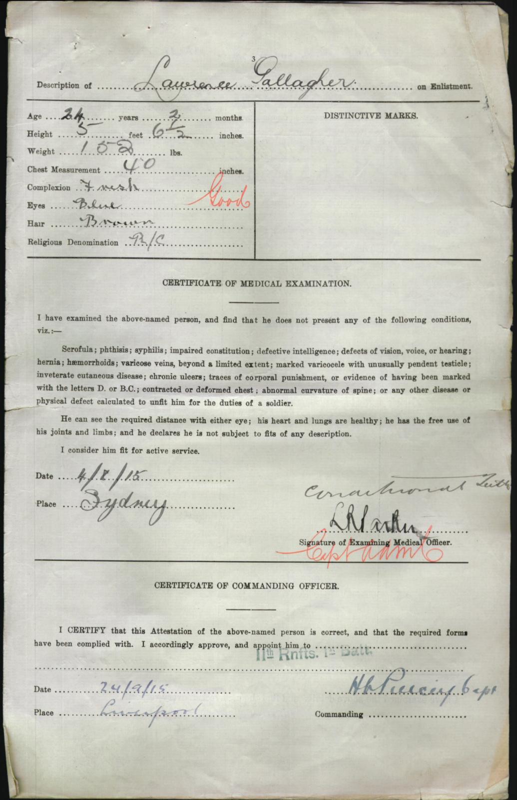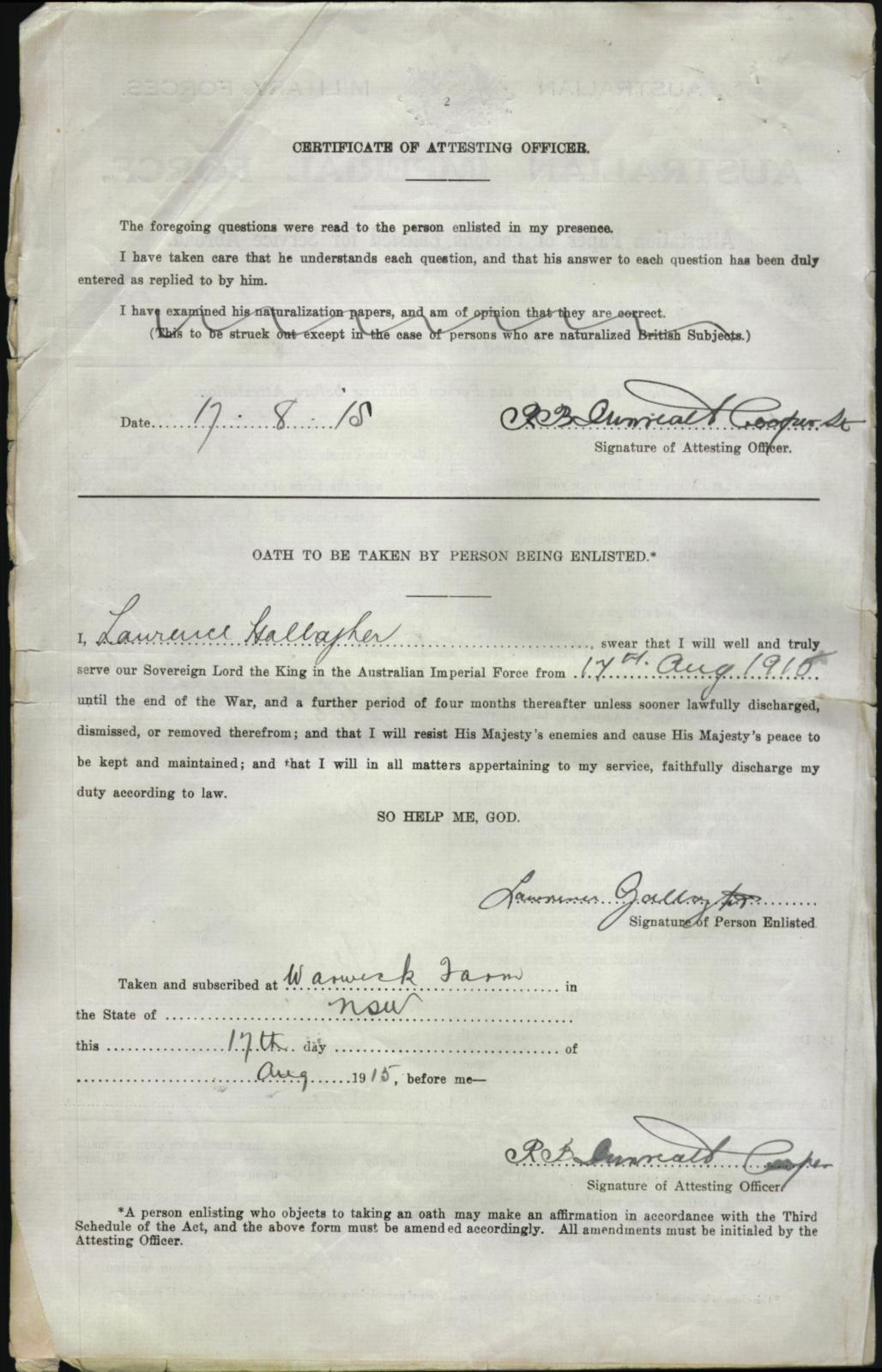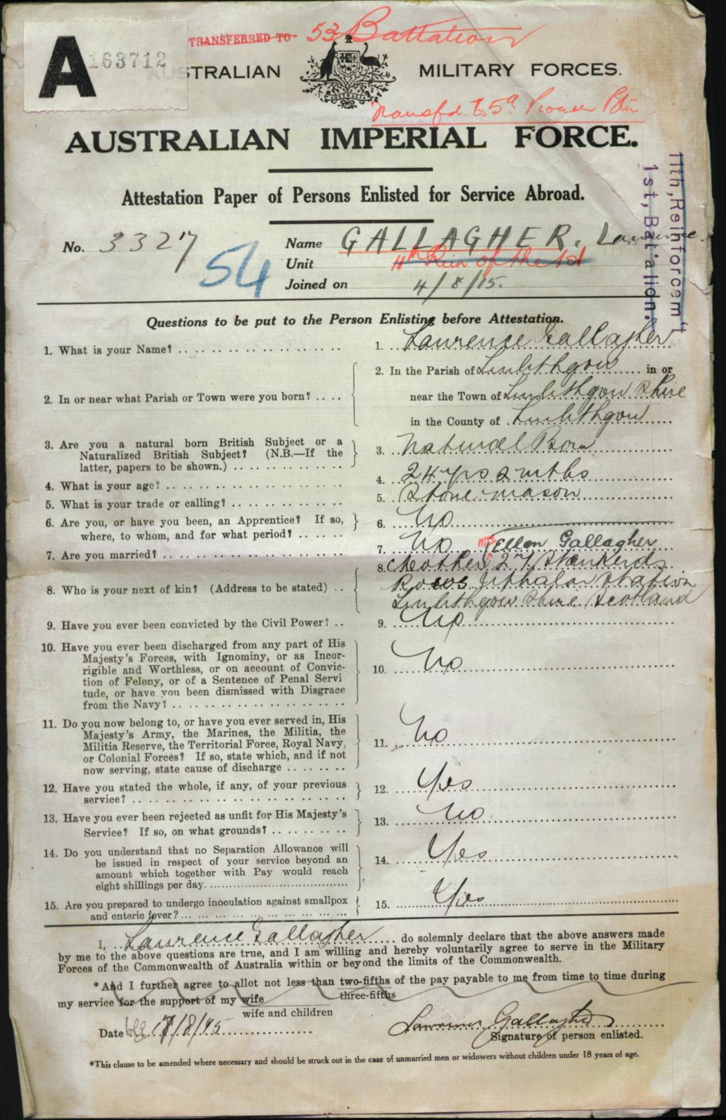 Lawrence Gallagher was born in Linlithgow Scotland, 1891. He enlisted in the AIF in August 1915, aged 24 years and two months and left Australia on board HMAT A32 Themistocles on 5 October 1915. His occupation is listed as 'stonemason':