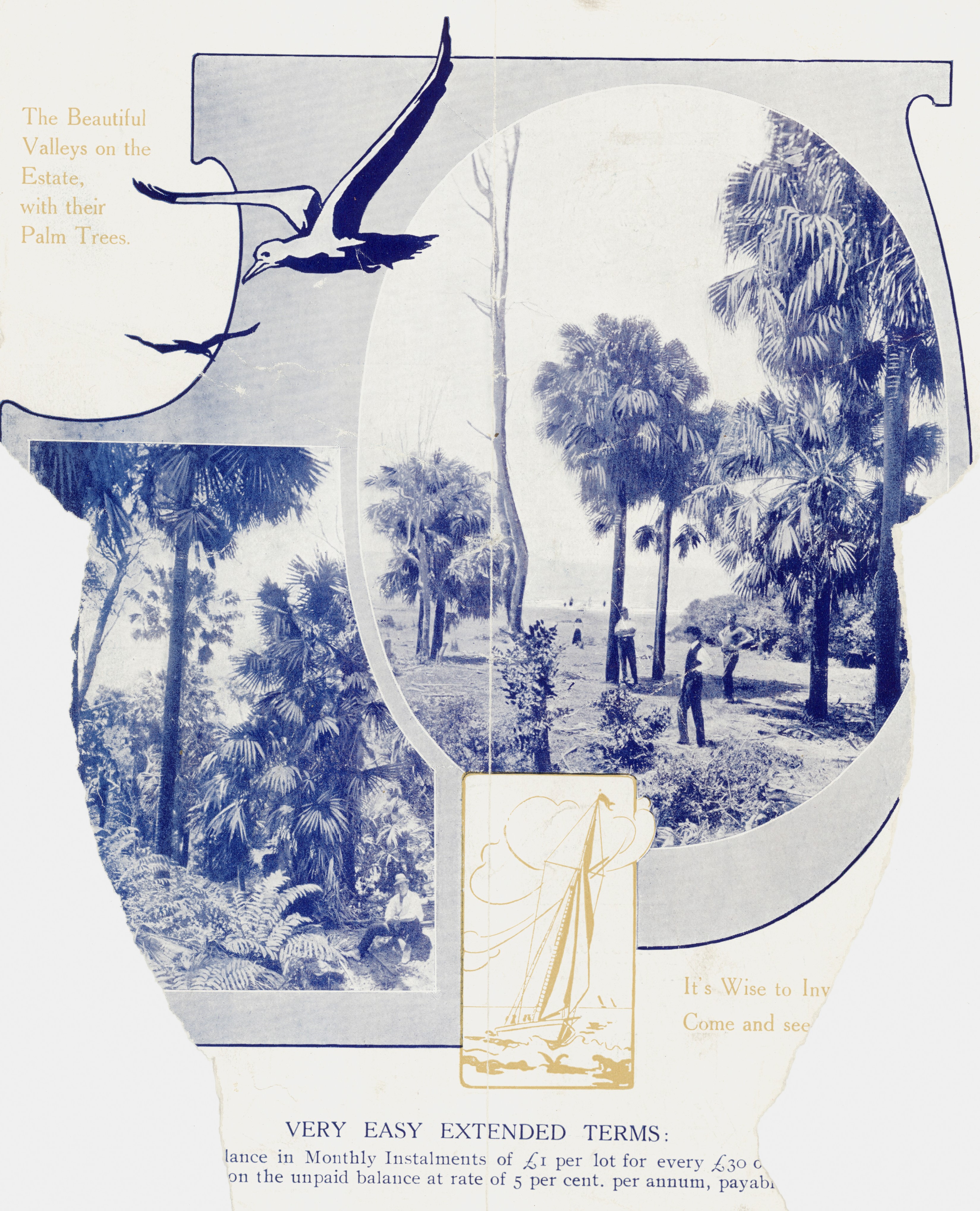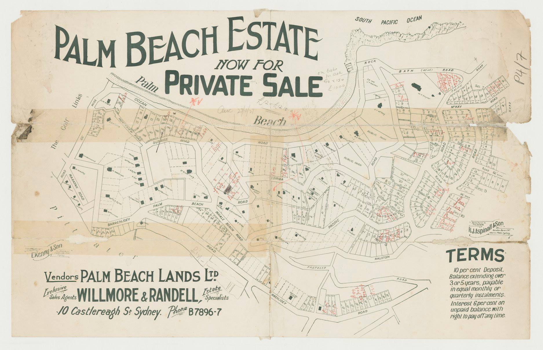 Section from a RAHS photo showing Palm Beach Estate Barranjoey advert circa 1912. Item: c16402_0008_c , courtesy State Library of NSW