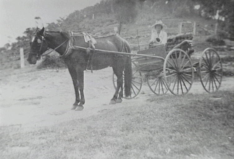 'On the Road to Newport' - Avalon Beach Historical Society Photo from 2018 Exhibition - possibly near the corner just prior to the 11 Mile Store - railing shown at side could be start of Hill View Crescent, Bungan Beach