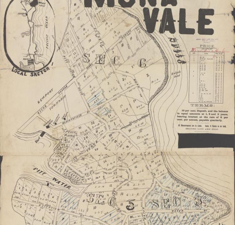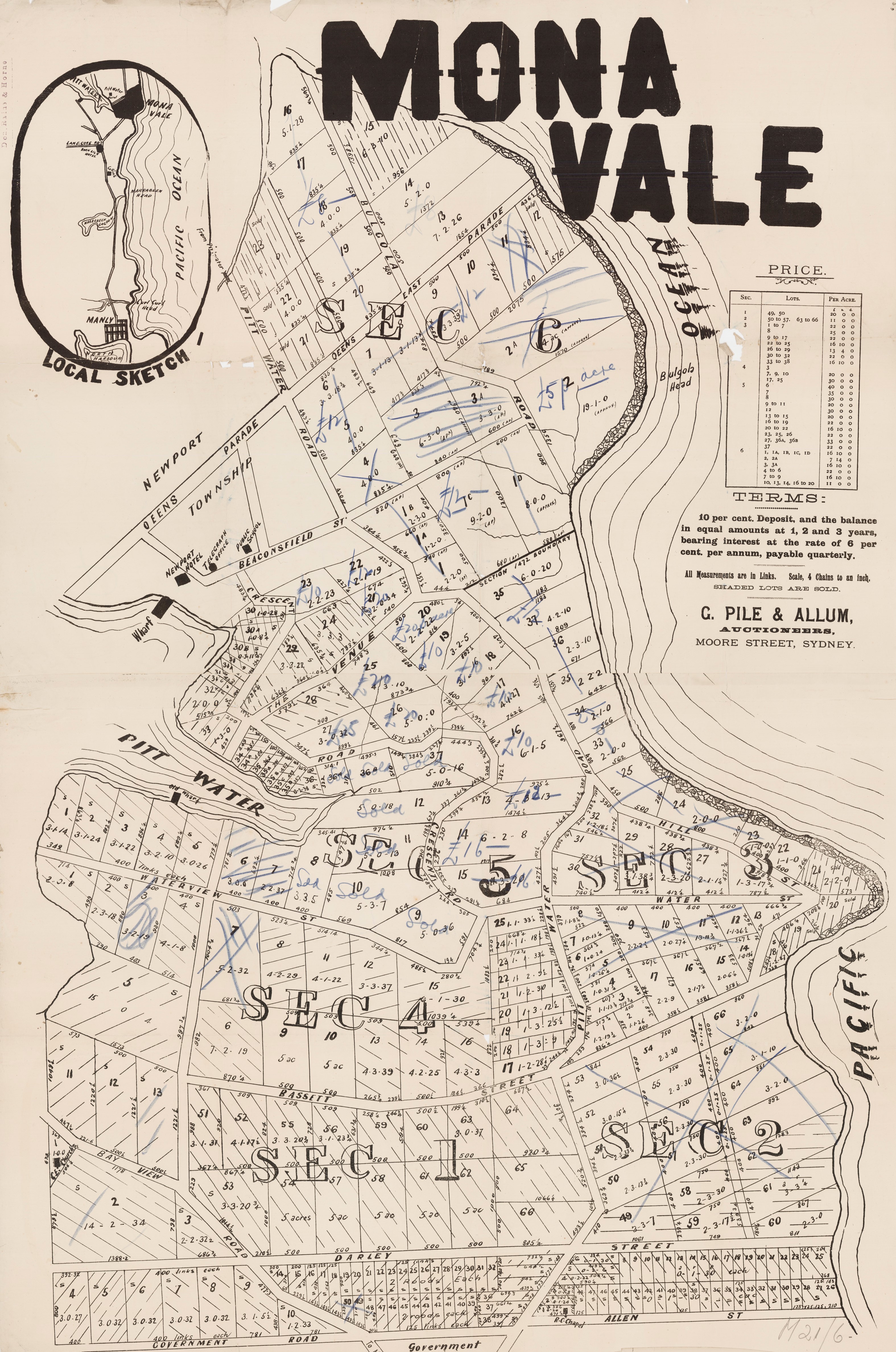 and lot 7, section 2, Mona Vale Estate, Pittwater, £15. Commercial. (1889, September 14). Evening News (Sydney, NSW : 1869 - 1931), p. 4. Retrieved from http://nla.gov.au/nla.news-article108100790