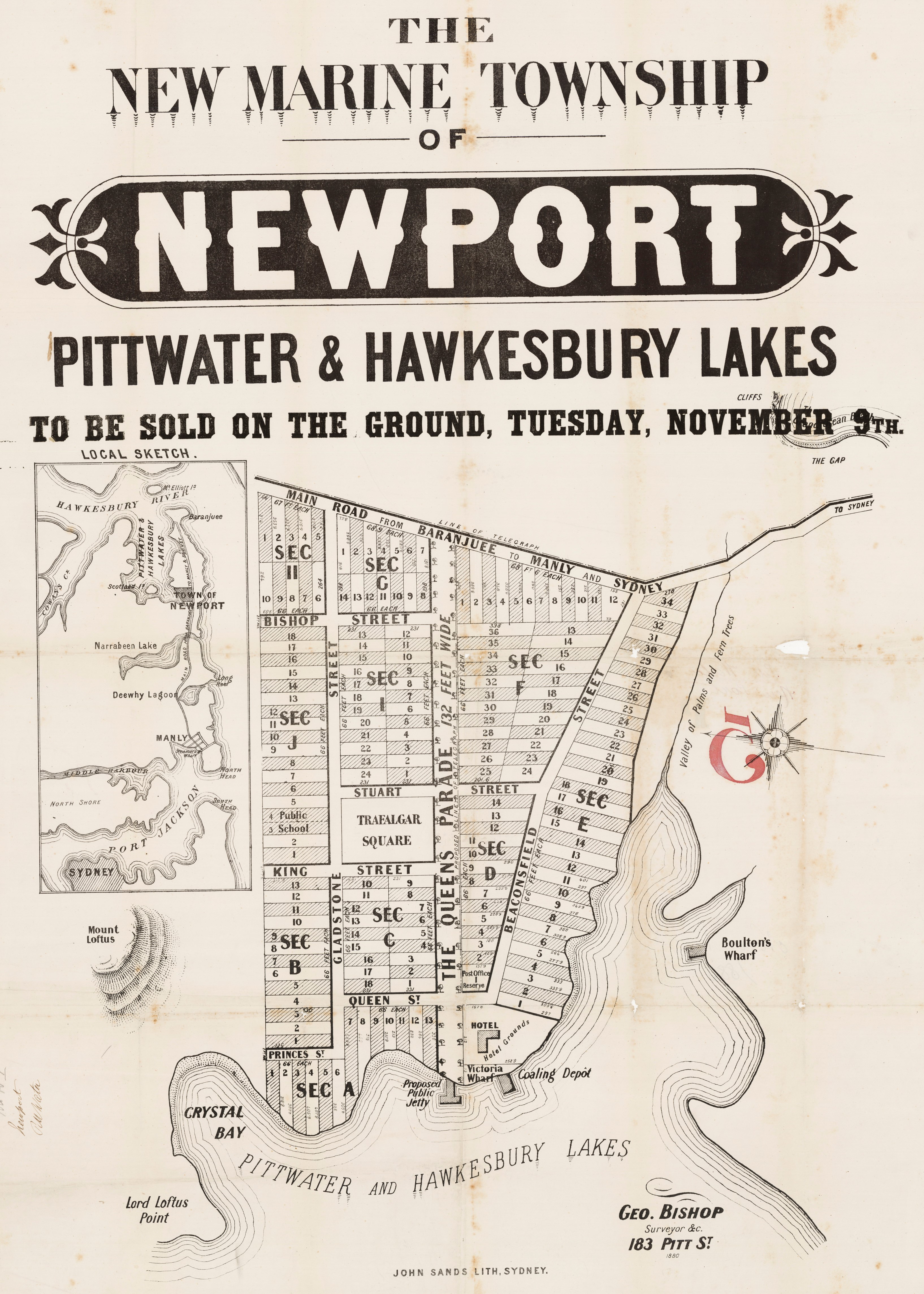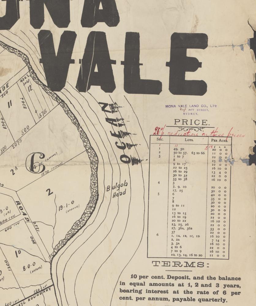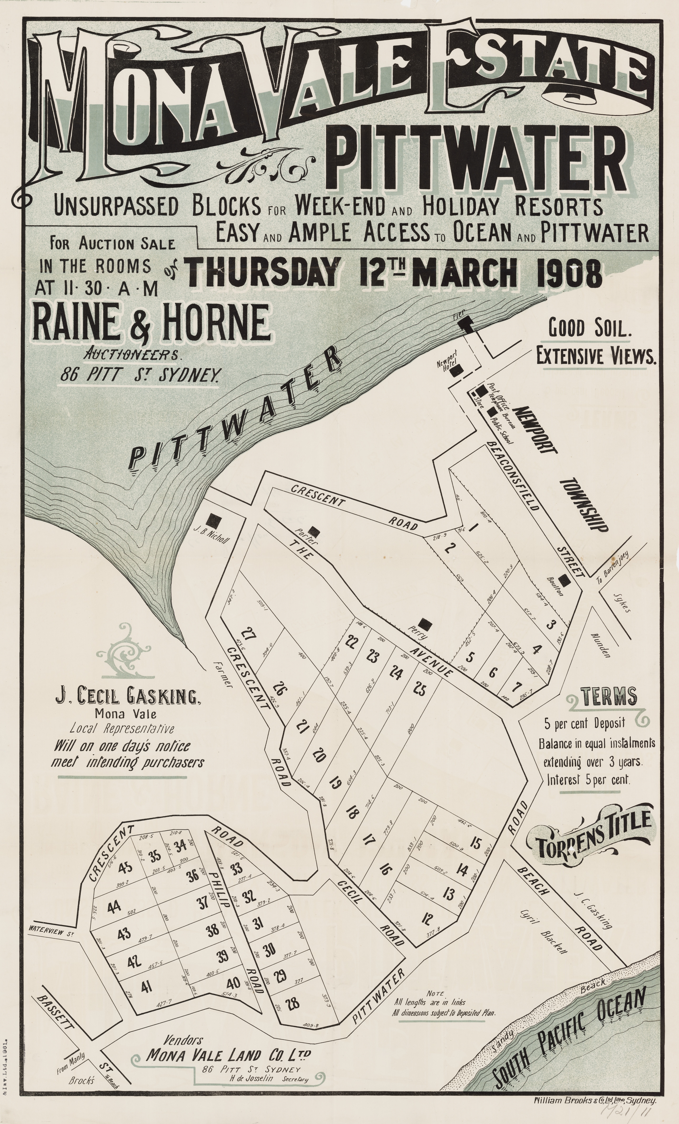 By 1891 the bulk of Bungan Beach and to the estuary side (Mona Vale and Newport) was under the control of the Mona Vale Land Company. The Mona Vale Land Company land was subdivided and sold in a number of sections.