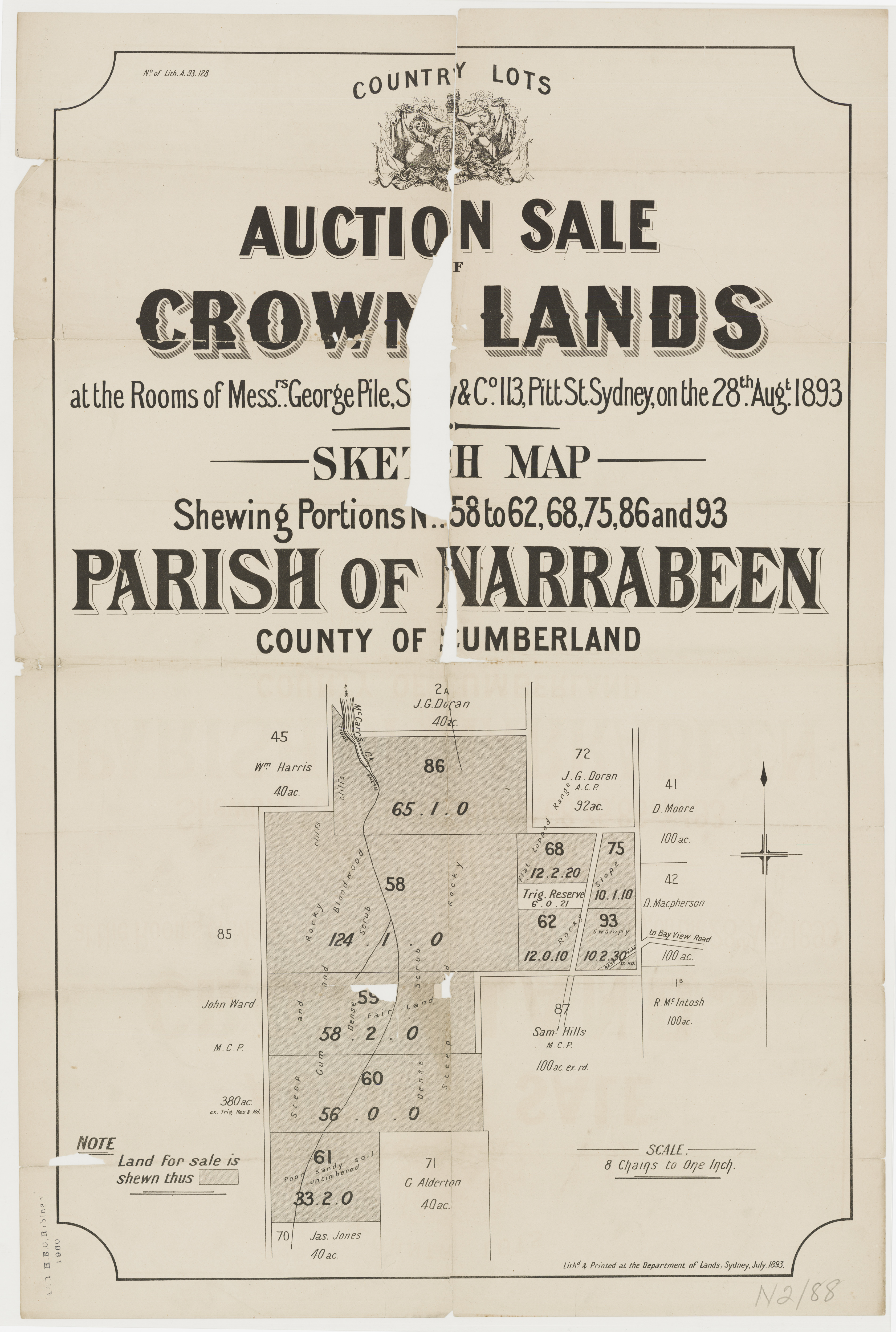 This grant is famed for the quality of its soil, and on It is some remarkably fine timber. Seeing the great attraction of MANLY BEACH and its surroundings, especially in this direction, and the consequent largo enhancement of value of ALL ELIGIBLE LANDS, the sale of this largo block will afford a good chance to SPECULATORS and OTHERS to acquire at a small cost an extensive area that in a very few years will discover to them AN ENORMOUS PROFIT by subdivision into smaller parcels.
