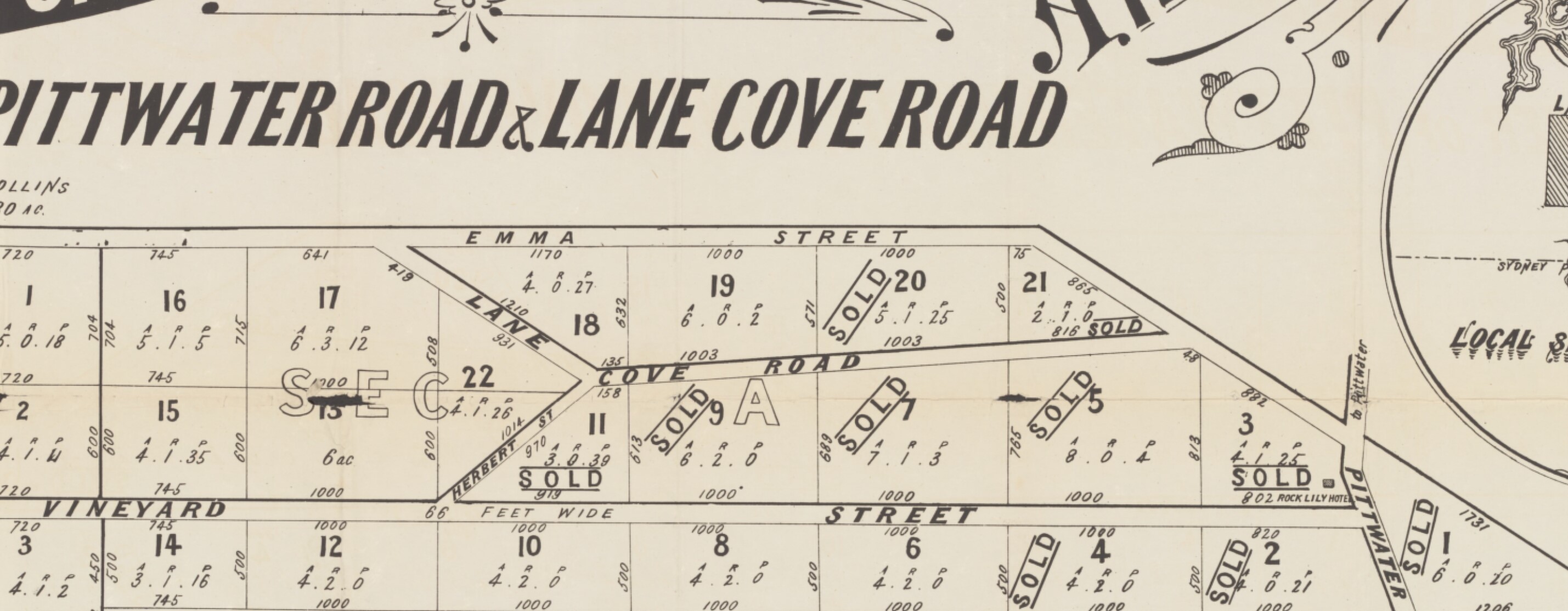 Access meant the large blocks of acreage may attract investors. David Moore, who also had a 100 acre holding sold as the 'Narrabeen Heights Estate' on the way to Collaroy, appears among the earlier sales, as does the Jenkins 350 acre holding in 1886: