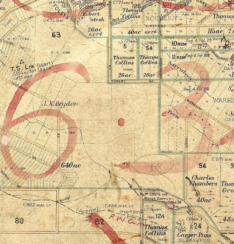 - 115 acres 2r. Advertised as Lot 1 on 22 November 1858 Purchased by Thomas Collins on 29 December 1858 for £115-10-0 Granted to Thomas Collins on 13 May 1859 [LTO SN150/680]