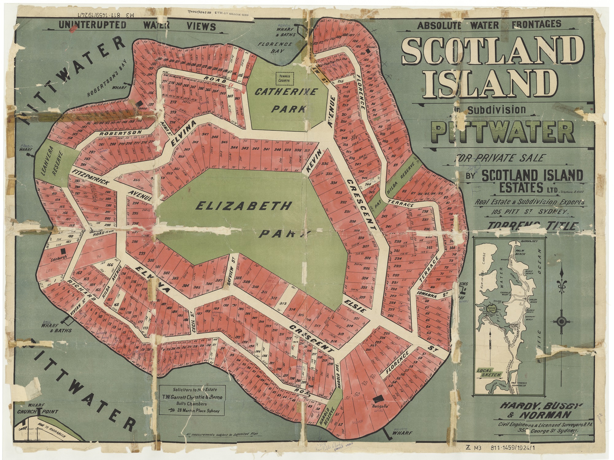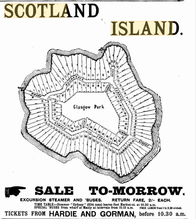 SCOTLAND ISLAND. — Hardie and Gorman, on Saturday, November 10, will offer 100 water frontage blocks on Scotland Island. Pittwater, near Manly. The terms are 10 per cent., the balance over ten years. Plans are available. COMING SALES. (1906, October 28). Sunday Times (Sydney, NSW : 1895 - 1930), p. 2. Retrieved from http://nla.gov.au/nla.news-article126557176