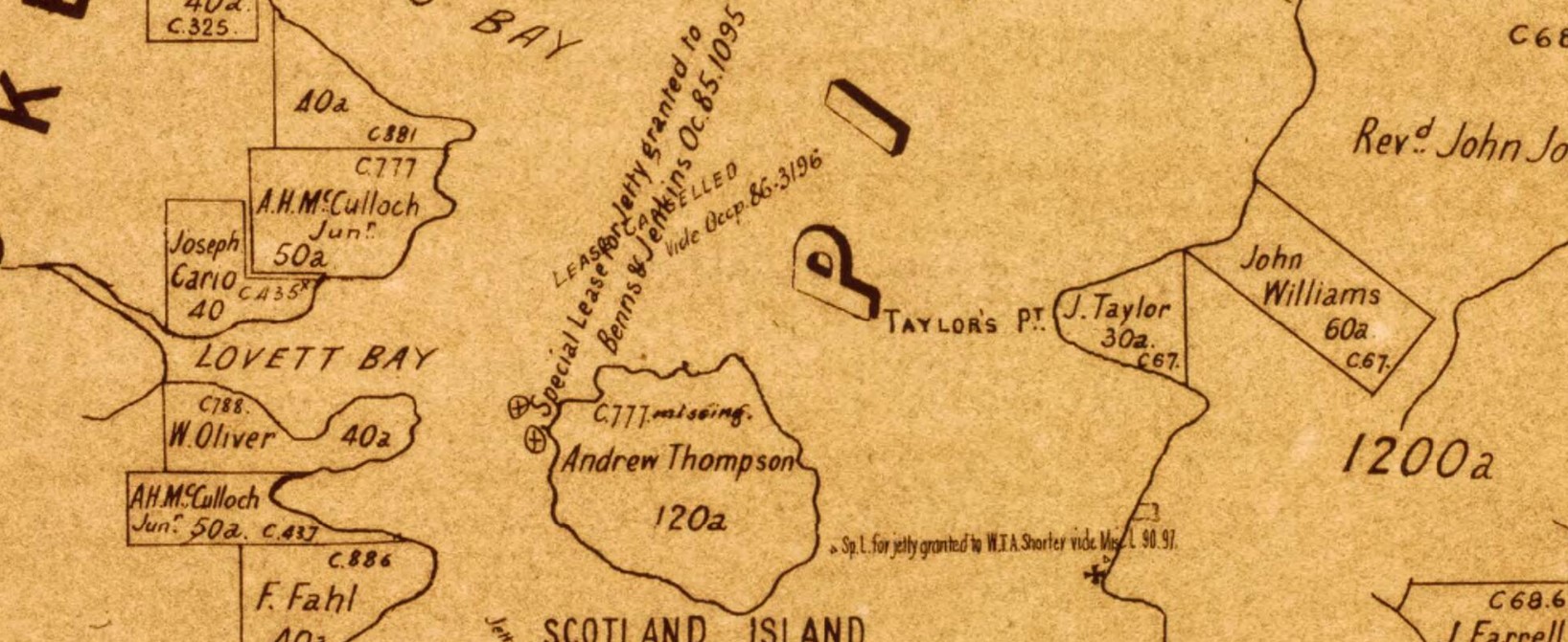 County of Cumberland, parish of Narrabeen, at Pitt Water, Scotland Island: Commencing on the high-water mark of Pitt Water, on the western side of Scotland Island; and bounded thence on the north by a line bearing westerly 168 feet; thence on the west by a line at right angles bearing southerly 5 feet; thence on the south by a line parallel to the first-mentioned boundary bearing easterly to the aforesaid high-water mark ; and thence on the east by that high-water mark northerly, to the point of commencement. APPLICATION TO MAINTAIN A JETTY. (1884, November 25). New South Wales Government Gazette (Sydney, NSW : 1832 - 1900), p. 7906. Retrieved from http://nla.gov.au/nla.news-article221632993