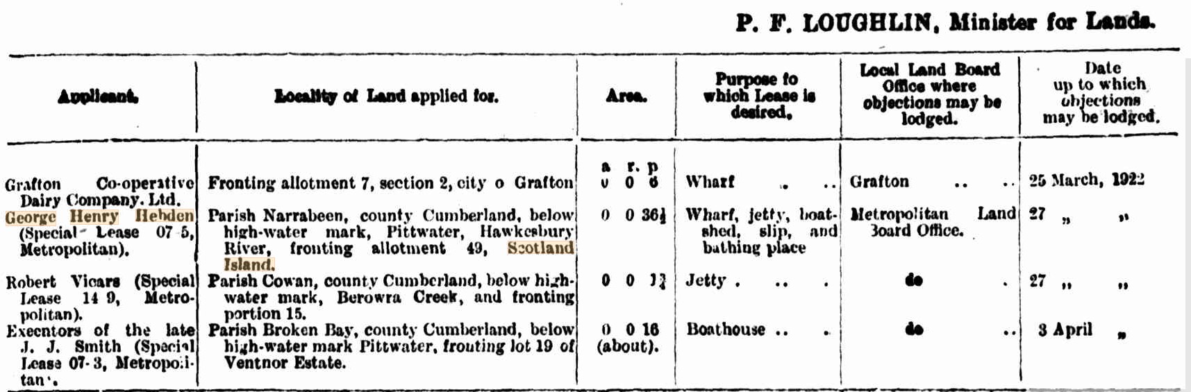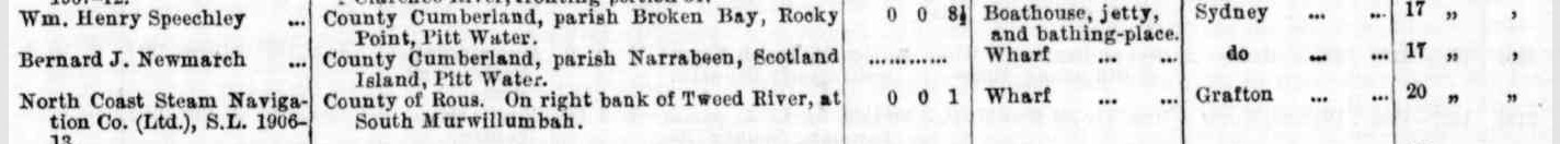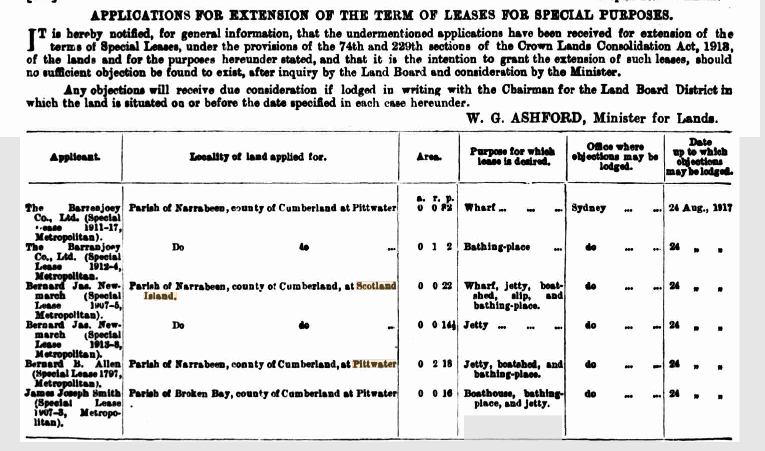Applicant: Bernard J. Newmarch. Locality: Co. Cumberland, Ph. Narrabeen, Scotland Island, Pittwater. For wharf. Advertising. (1907, April 13). The Sydney Morning Herald (NSW : 1842 - 1954), p. 6. Retrieved from http://nla.gov.au/nla.news-article28151646