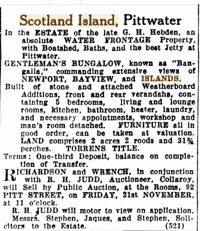 SCOTLAND ISLAND-P1TTWATER.— Detached Cottage. "Yamba." Hardie and Gorman Proprietary, Ltd. Advertising (1928, March 28). The Daily Telegraph (Sydney, NSW : 1883 - 1930), p. 29. Retrieved from http://nla.gov.au/nla.news-article245429940