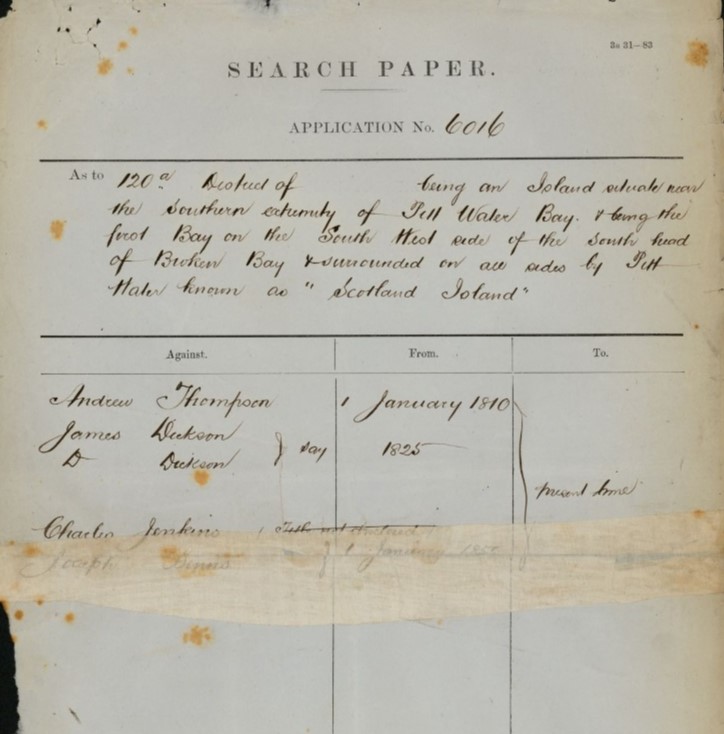 When Jenkins and Benns discovered those who had claimed ownership of the island did not have title they ceased paying rent and continued living there and applied for the Title. [ NRS-13012-3-[6/10095]-Primary Application 6016; Title: Primary Application - Charles Jenkins and Joseph Brinns, Scotland Island Contents Date Range: 04-02-1884 to 08-02-1892]