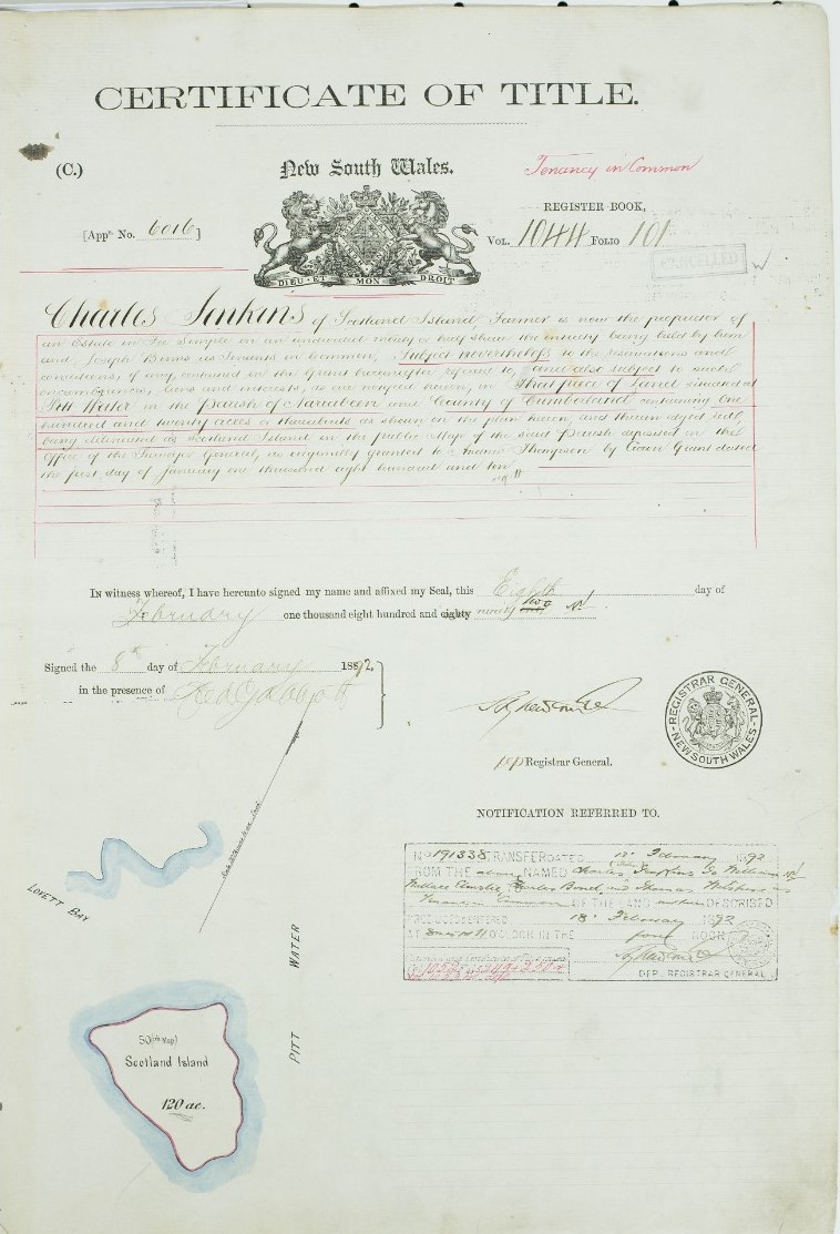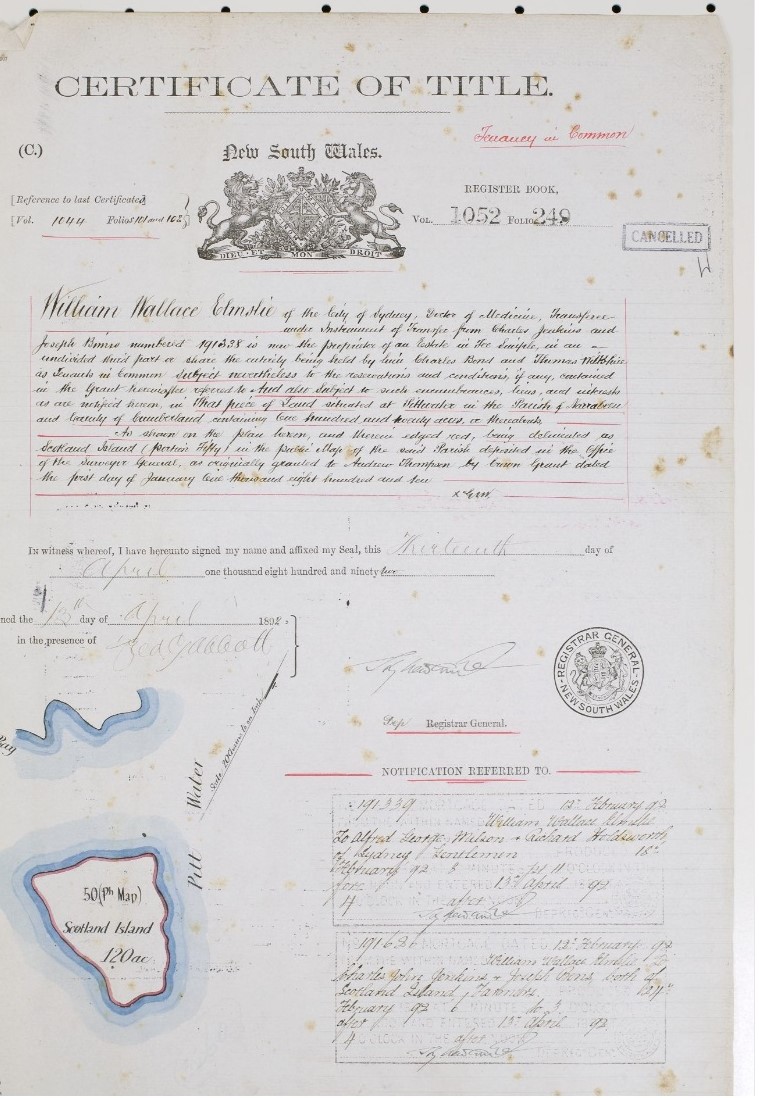 Certificate of Title Vol-Fol 1044-101 and 102 was issued on February 8th 1892 and the whole island was transferred on February 12th 1892 to William Wallace Elmslie (Doctor of Medicine – who took a mortgage with Alfred George Milson and Richard Holdsworth and the Stephens-Godbolds), and Charles Bond (Tailor; same per mortgage) and Thomas Wilshire (Civil Servant):
