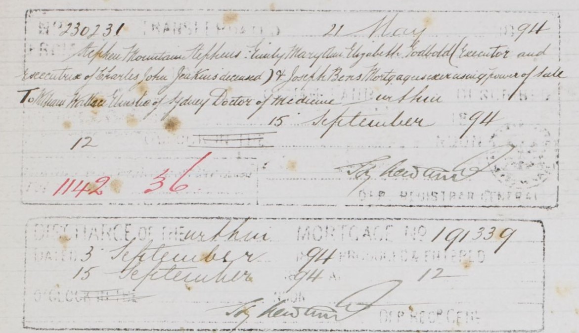 Elmslie, Bond and Wilshire have discharged this mortgage by May 21st 1894. The land holding then comes under. Vol- Fol: 1142-36 for all three holdings with William Wallace Elmslie issued the Certificate of Title in 1894.
