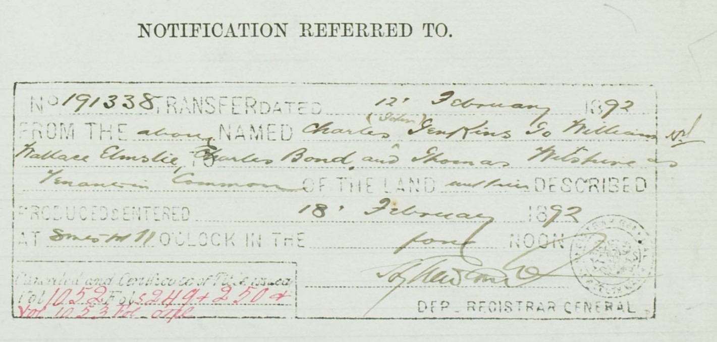 However, he was unable to prove their ownership satisfactorily, and Certificates of Title were issued to Joseph Benns and Charles Jenkins on 8 February 1892, mainly on the grounds of continual possession.