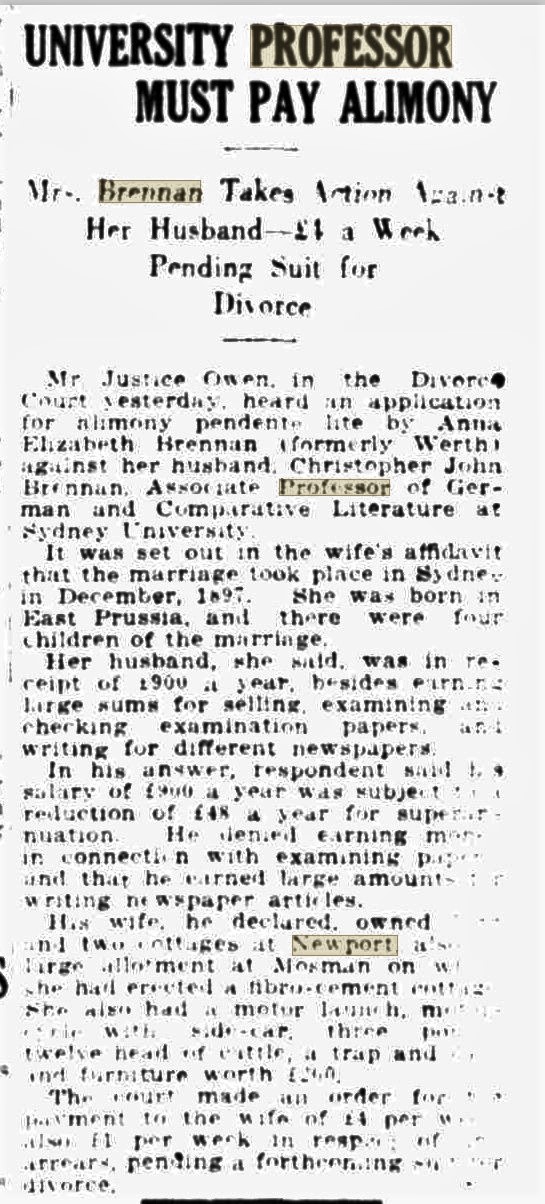 Philomena Catherine Brennan (formerly Jarmain) v Christopher John Brennan. Marriage, September 29, 1928, Mosman, Roman Catholic rites. Issue, adultery. Decree nisi. Mr. S.V. Toose (instructed by Mr. Mervyn Finlay) for petitioner. IN DIVORCE. (1940, September 4). The Sydney Morning Herald (NSW : 1842 - 1954), p. 6. Retrieved from http://nla.gov.au/nla.news-article17709427
