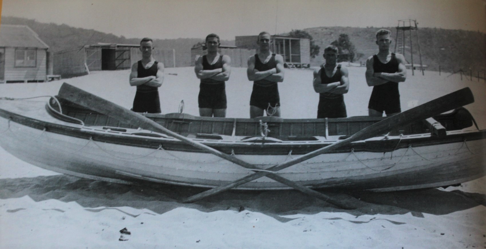 From left: George Meillon, G.D. Banks, A. M. Stayner, Chris Brennan and Gordon Robertson. The Clubhouse can be seen in the background on the left - the boatshed and change sheds and shark tower are also visible.