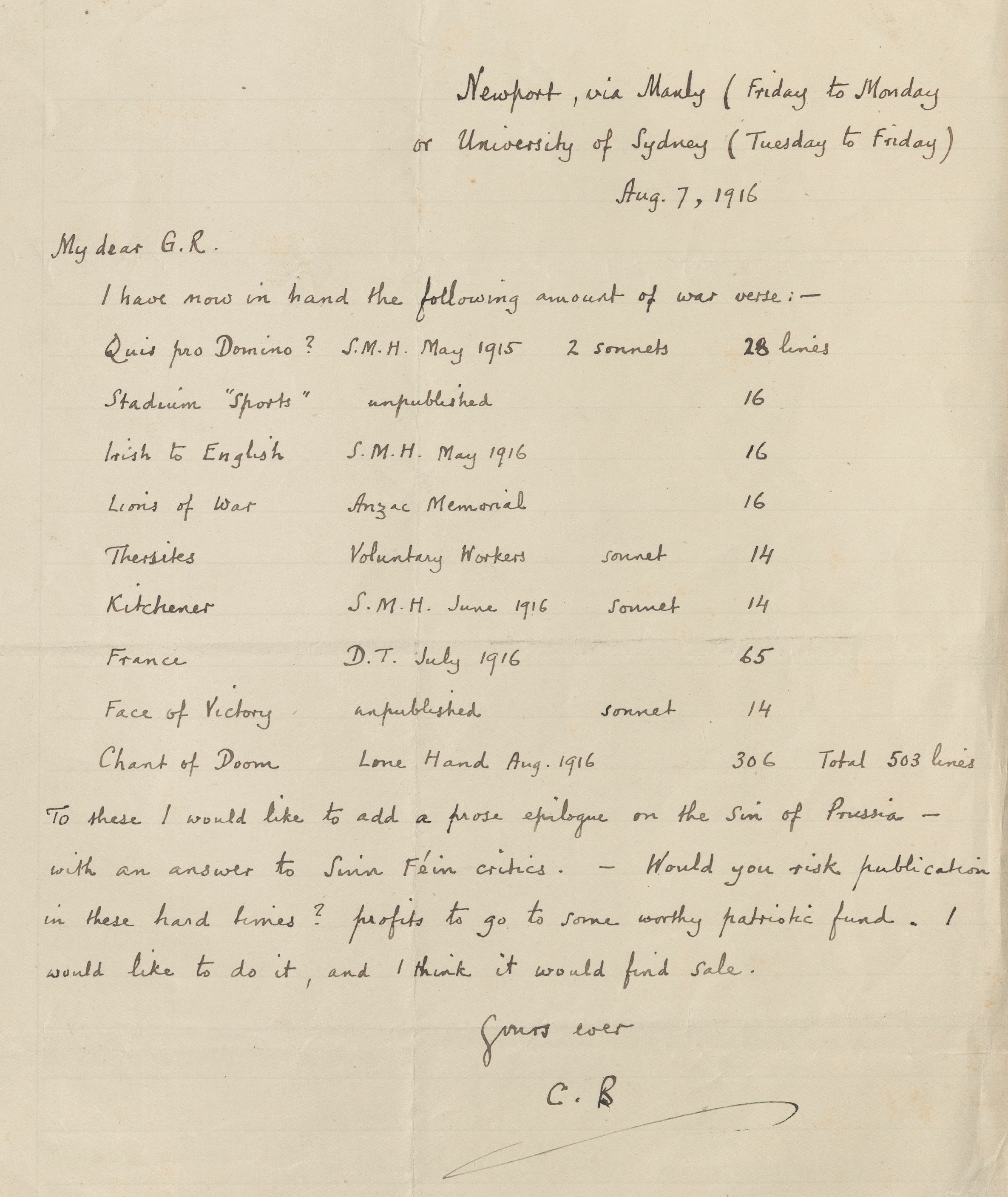 Half-title has been altered by the poet to read Poems by C.J. Brennan Below this he has written, "The new volume (to be published by G.B. Philip & Son) is to begin like this booklet, i.e., the half-title must be the first page of a section, the title-page the third, etc., etc." The printer or publisher's editor however, ignored this instruction.