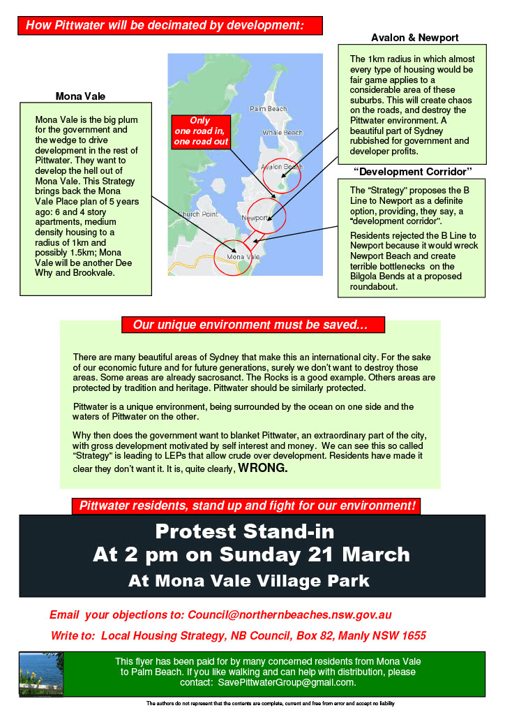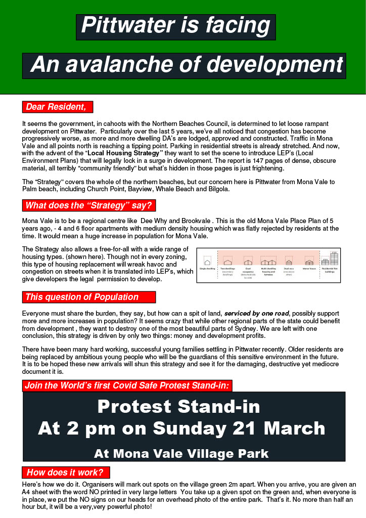 Proposal for housing Densification of Pittwater Unpopular with Residents: Protest organised for march 21st