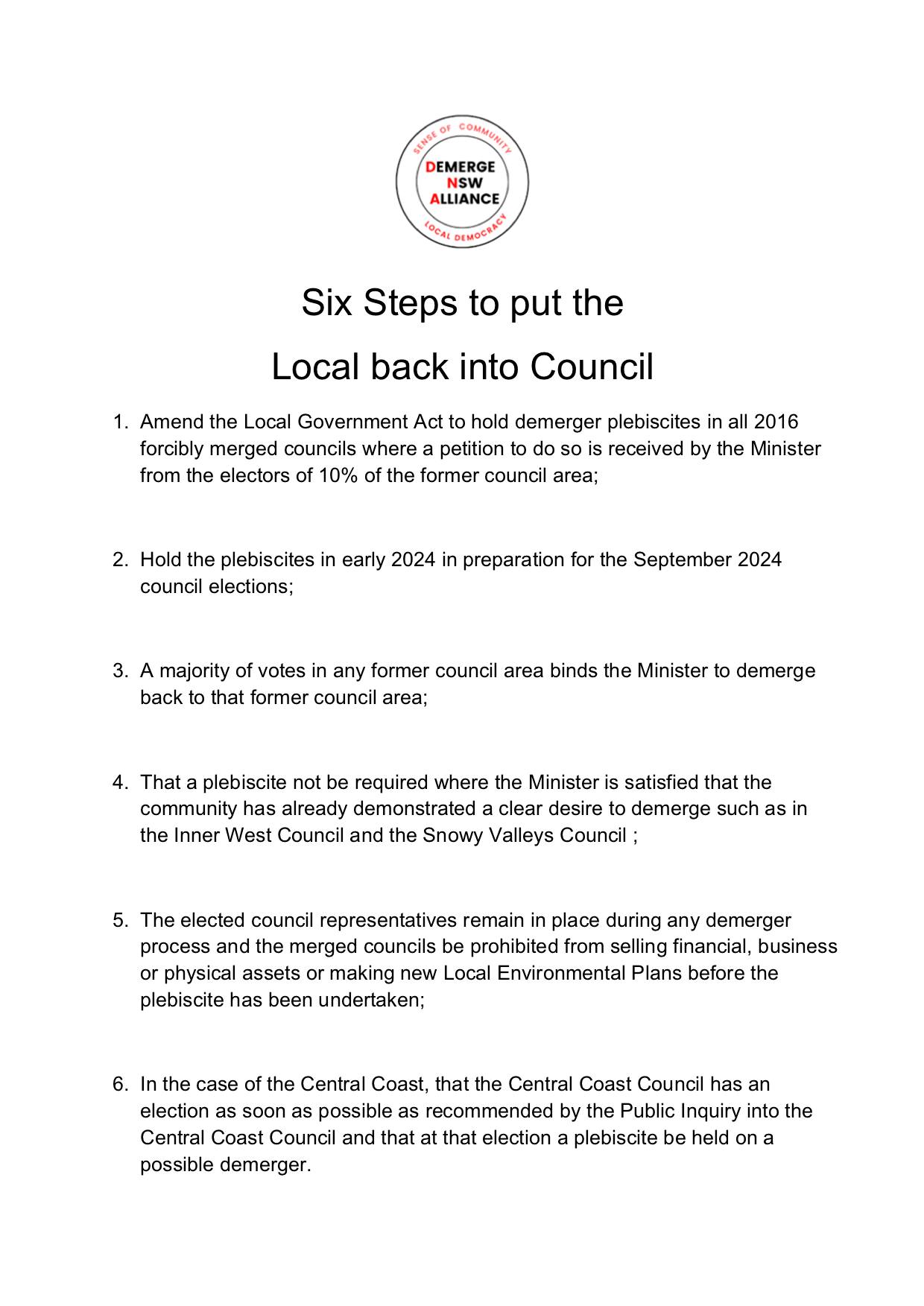 DNA this week released its six point strategy for council deamalgamations. It includes a call to candidates at the NSW election to support a binding demerger poll in any of the former council areas that have been amalgamated and can present a petition in support signed by 10 per cent of residents.