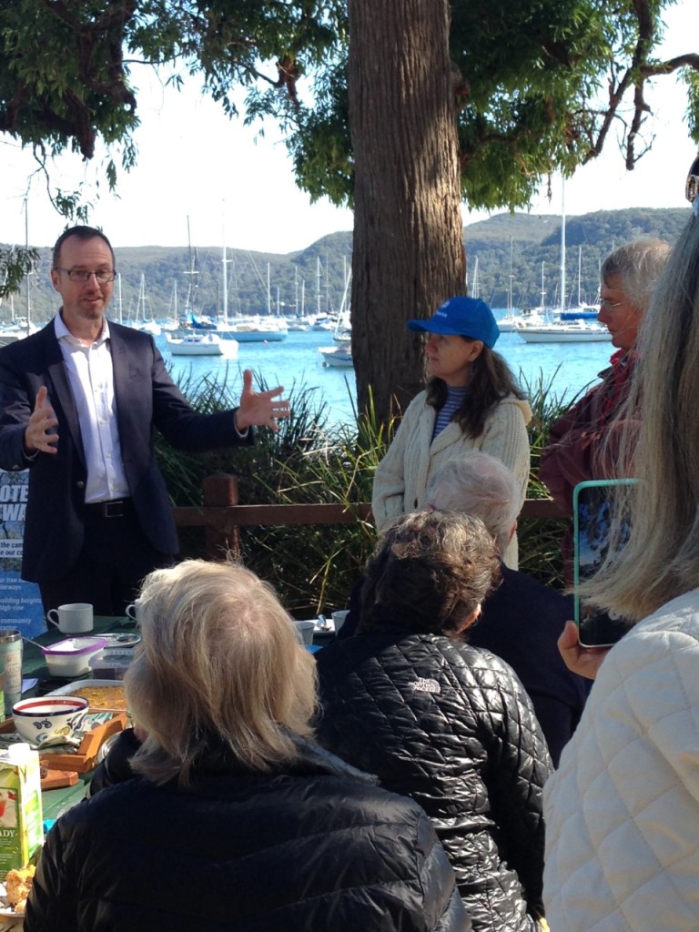 David Shoebridge speaking to residents during morning tea, hosted by Northern Beaches Greens at Clareville, with Greens candidate for Pittwater Miranda Korzy next to him (in cream jacket and blue Pittwater cap).