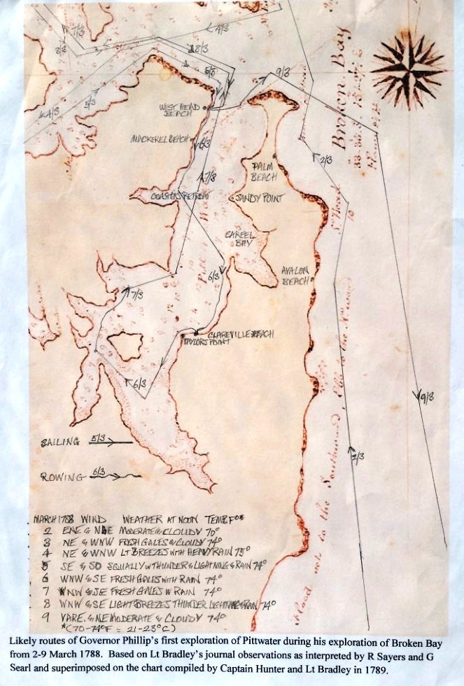 Below is a revised version of the earlier story in Pittwateronlinenews ..this time with a map showing Geoff Searl and Roger Sayers assessment of his most likely routes in out and around Pittwater on 5, 6, 7, 8 and 9 March 1788.